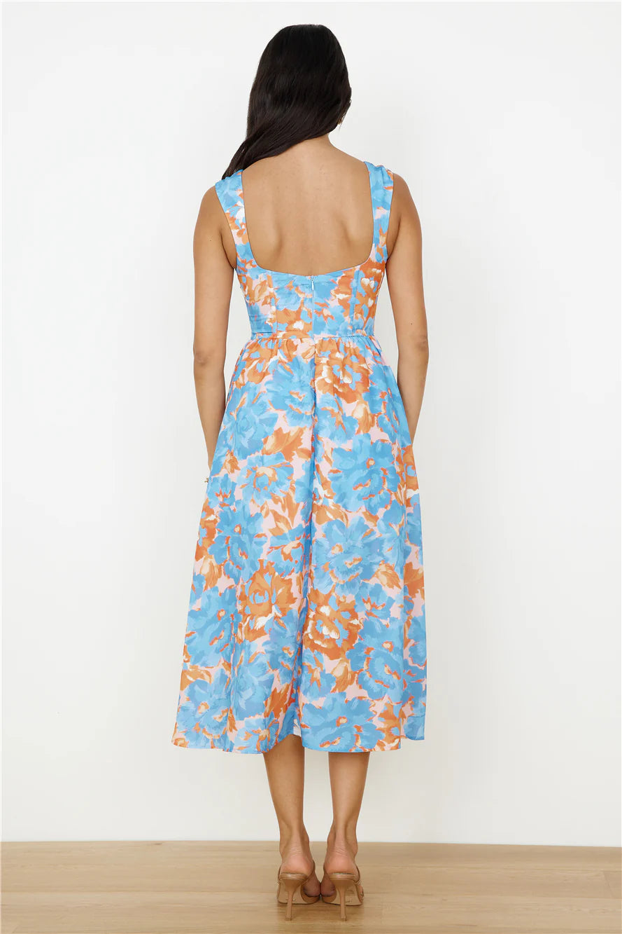 Fly up and away to the destination of your dreams and feel good knowing you have the All Day Midi Dress in Blue in your suitcase. This dress is a great statement piece to have in your vacation wardrobe. Style with platform sandals and a bag to match.