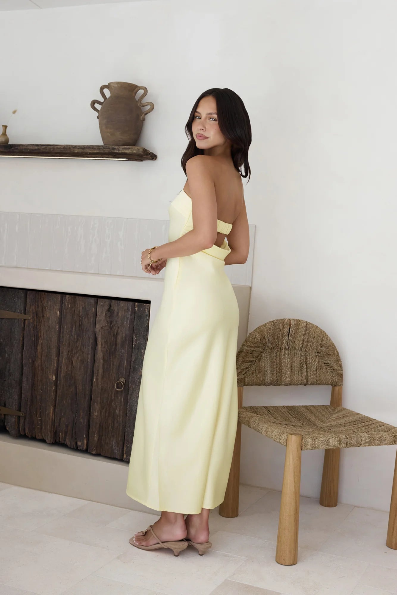 The Aloha Strapless Satin Maxi Dress in Yellow embodies tropical elegance and sunny charm, perfect for beachfront weddings in Maui or sipping cocktails at sunset in the Caribbean. Embrace the spirit of island paradise with this stunning dress, designed to make every moment radiant and memorable.