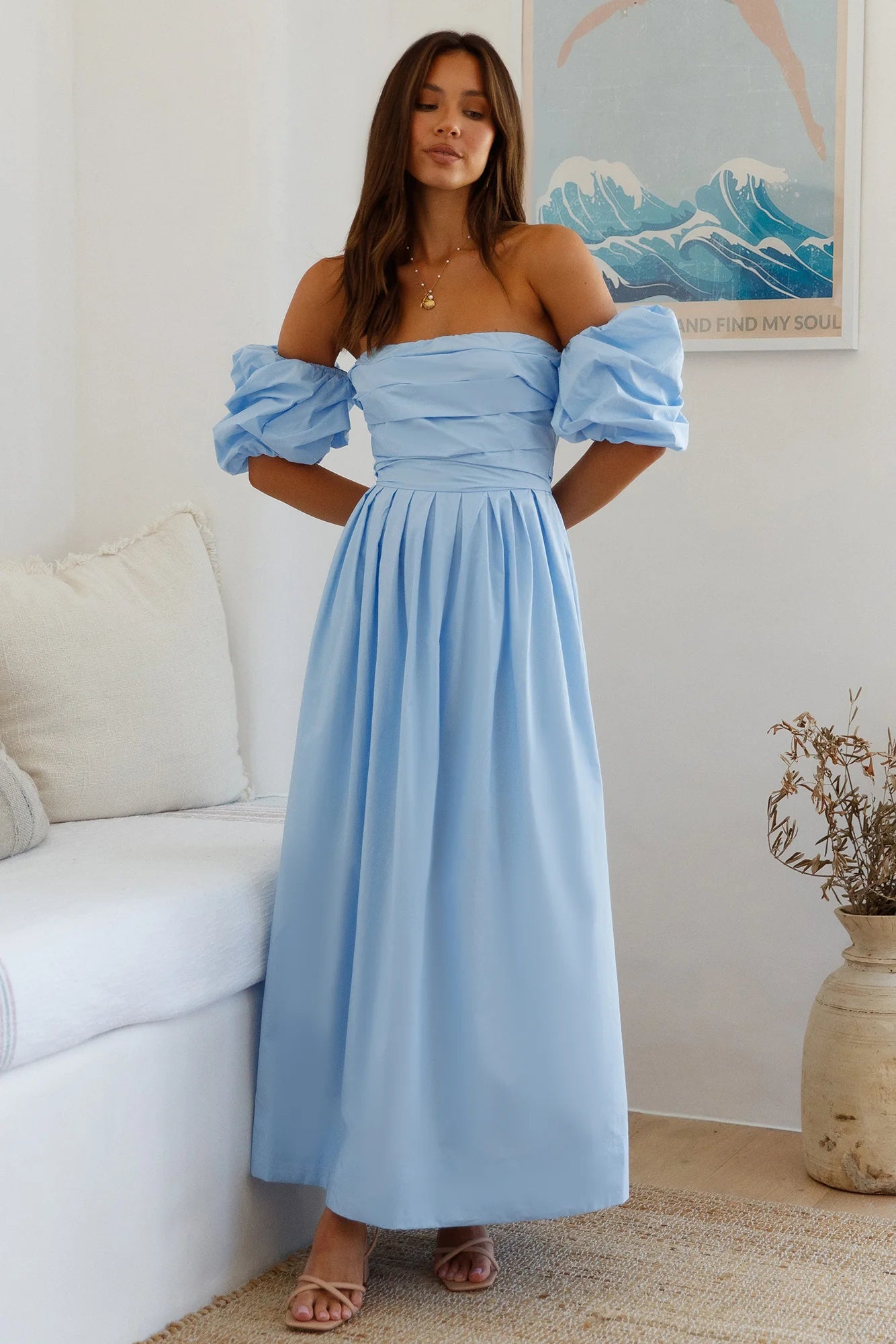 The Bella Off Shoulder Maxi Dress in Blue is a timeless classic dress for any dressy event. It exudes elegance and effortless especially when paired with while heels and dainty gold adornments.