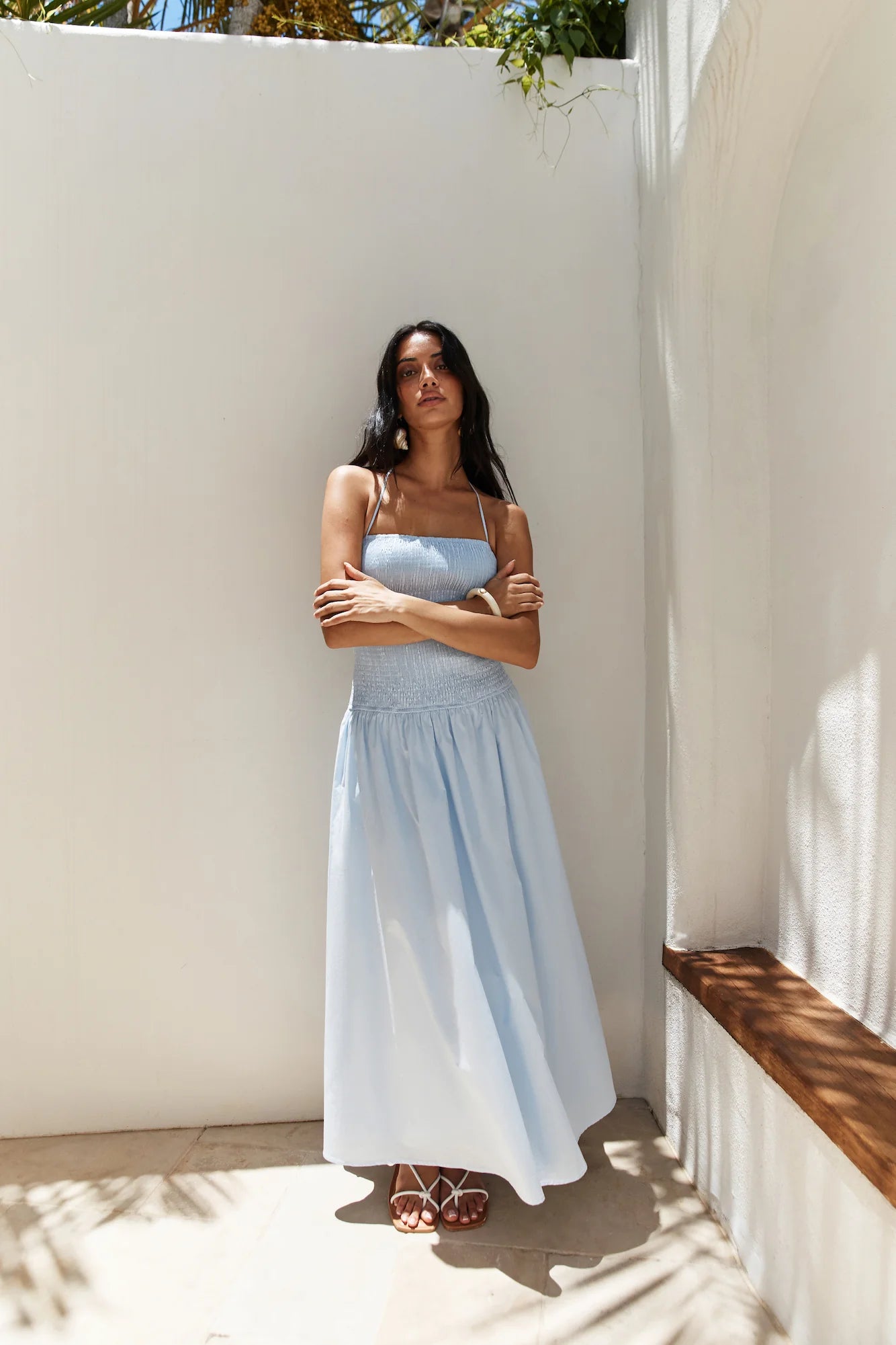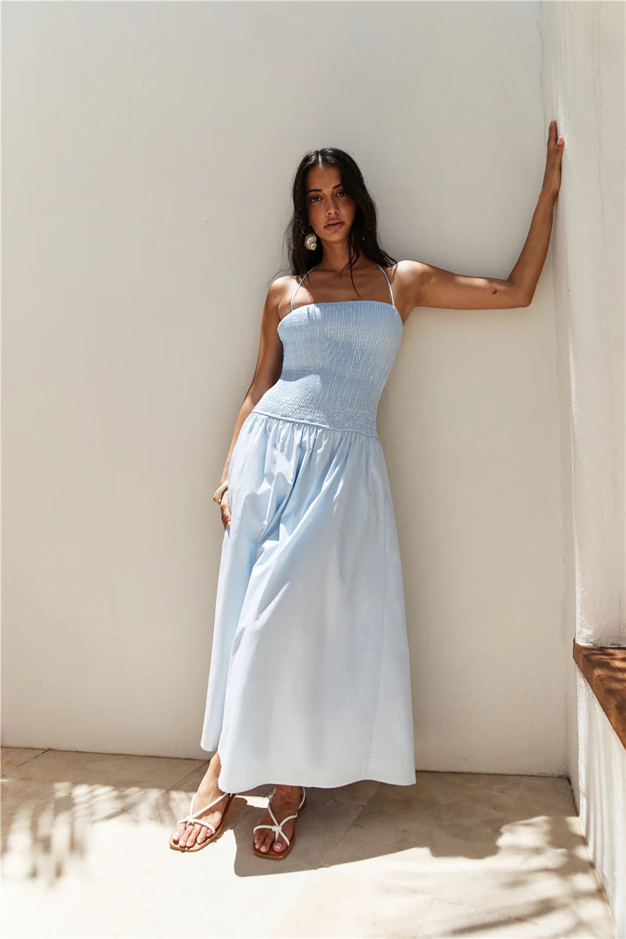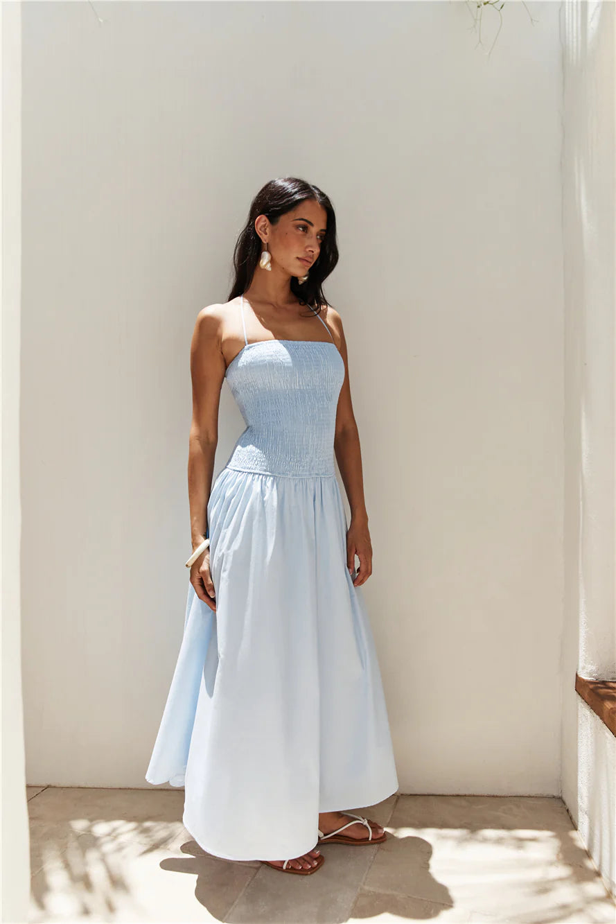 Bask in effortless elegance with the Blessed Destiny Maxi Dress in Blue, a dreamy staple for sun-drenched days and balmy evenings. Crafted in a soft pastel blue, this piece features a smocked bodice that flatters your silhouette while offering all-day comfort.