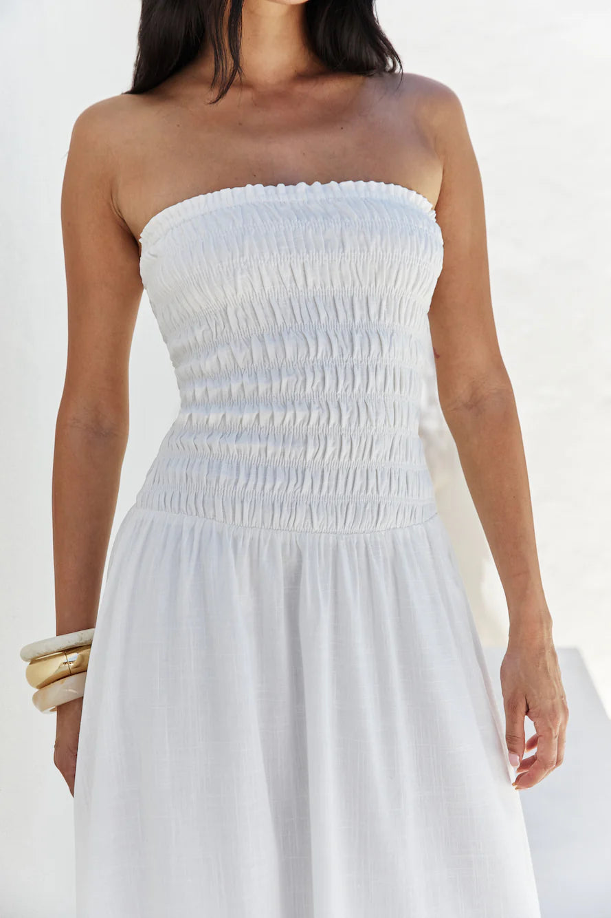 Embrace the sun-kissed days and balmy evenings in the Crafted in a crisp, breezy white, this strapless silhouette features a smocked bodice that hugs your figure while providing effortless comfort. The relaxed, flowy skirt drapes gracefully to a maxi length, making it perfect for beachside strolls or sunset dinners.