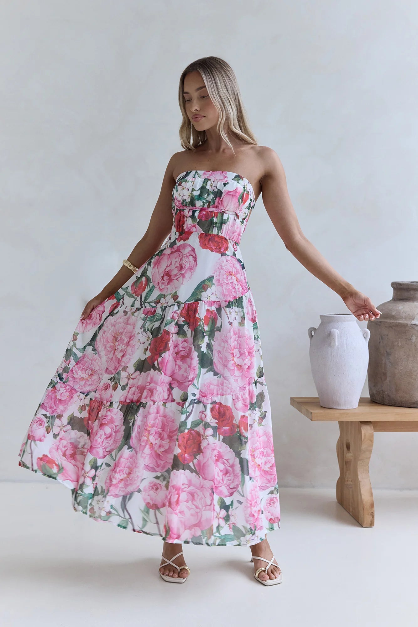 Made for every spring occasion, the Bouquet In Bloom Strapless Maxi Dress was made for the romantics. Style with mules and gold jewellery for your next event.