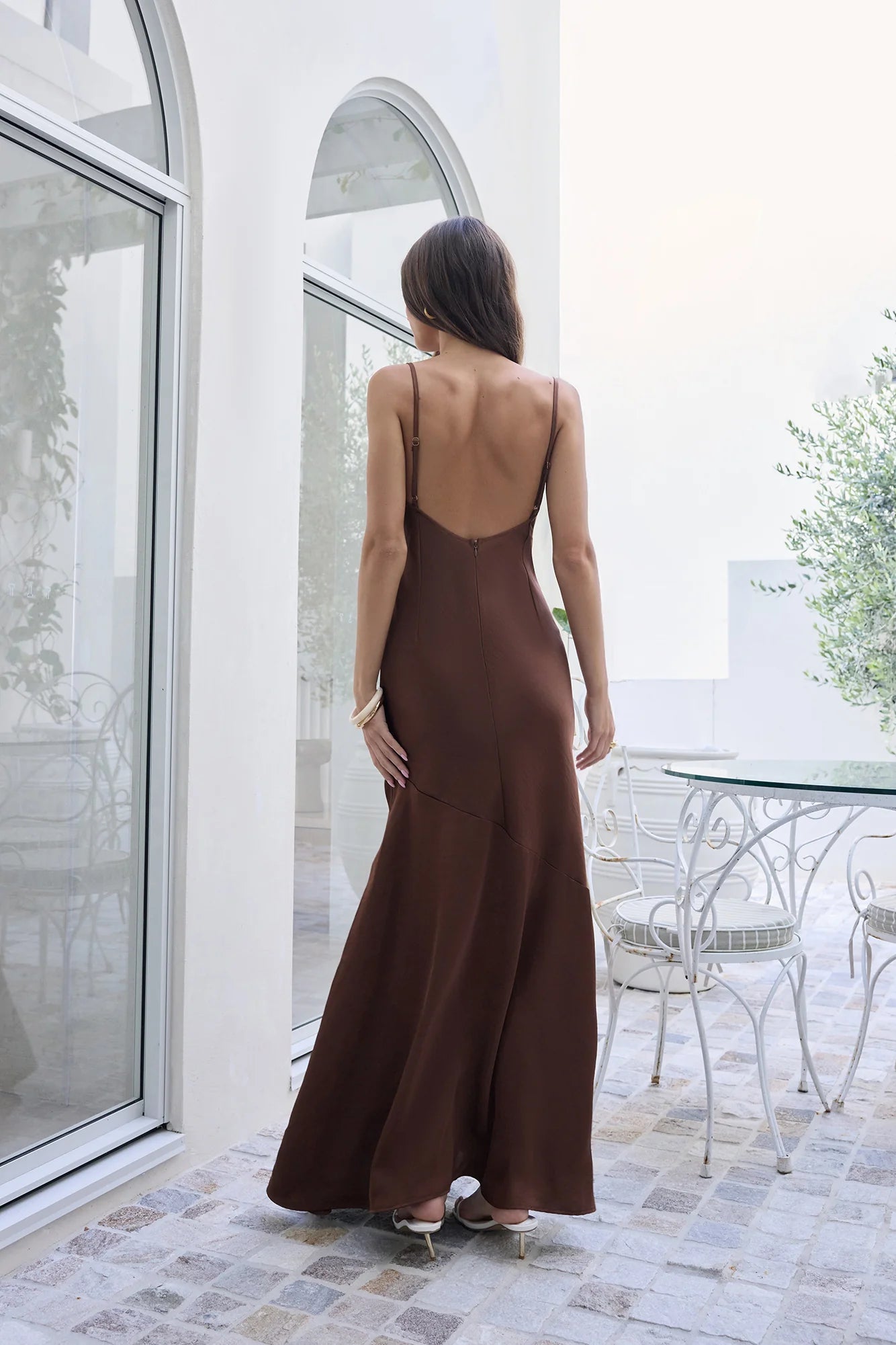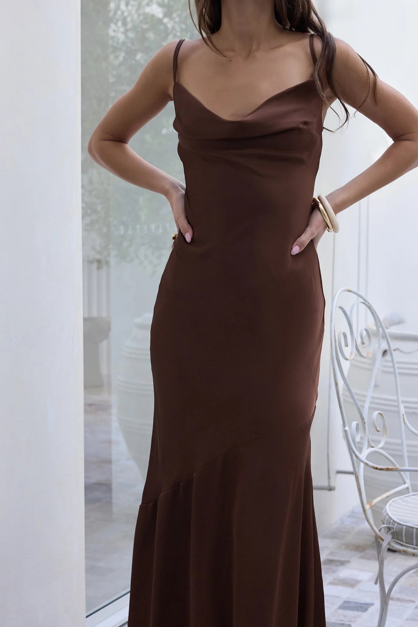 The Brilliant Belle Satin Maxi Dress features a silky satin fabric with a graceful cowl neck and flowy skirt, complemented by an elegant open back. Style it with delicate jewellery and strappy mules for a radiant, sophisticated look.