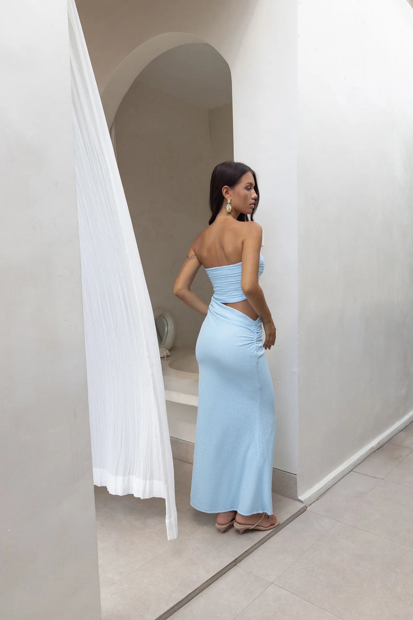 Shine in the City Hopper Strapless Maxi Dress, featuring a textured, detailed top with a waist cutout and a straight, flowy skirt—perfect for cocktail events or chic evening outings.