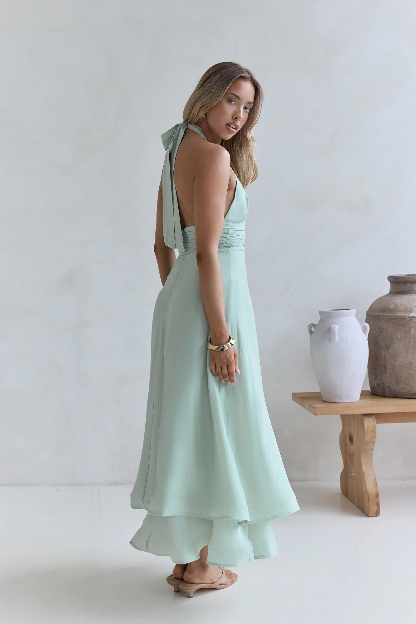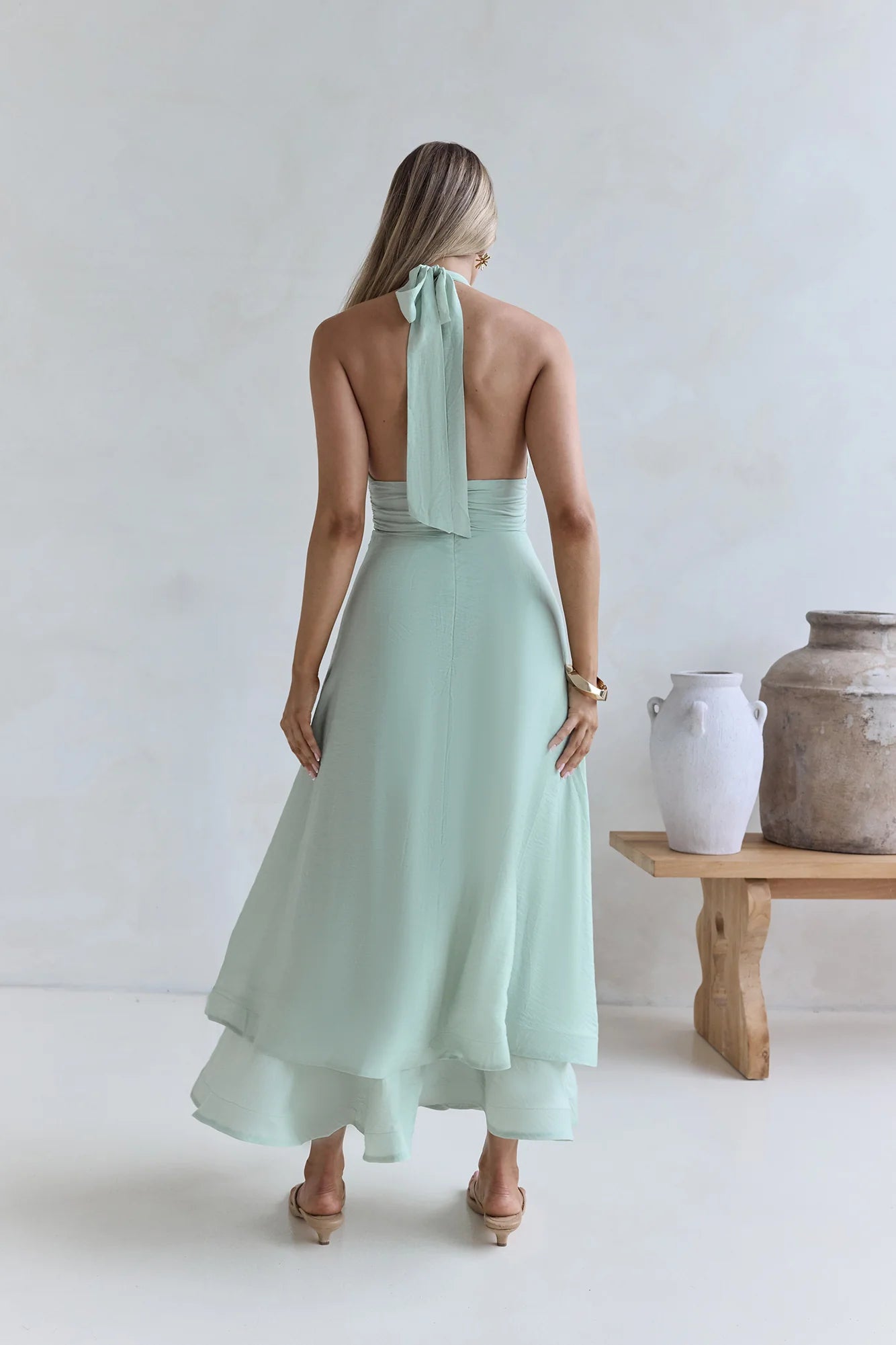 The City Lights Calling Maxi Dress is all about dreamy elegance, featuring a halterneck tie, gathered waist detail, V-neck, and a voluminous high-low skirt that’ll have you glowing with every step! Style with heels.