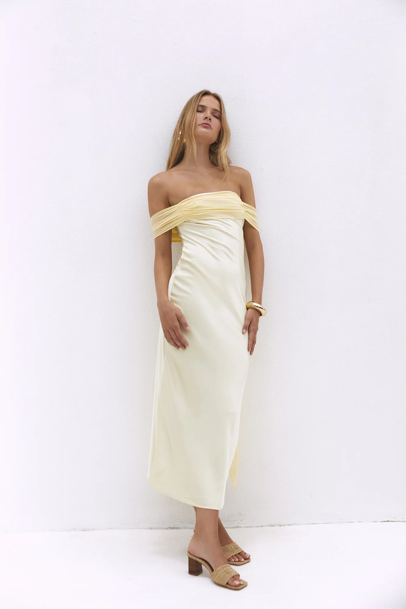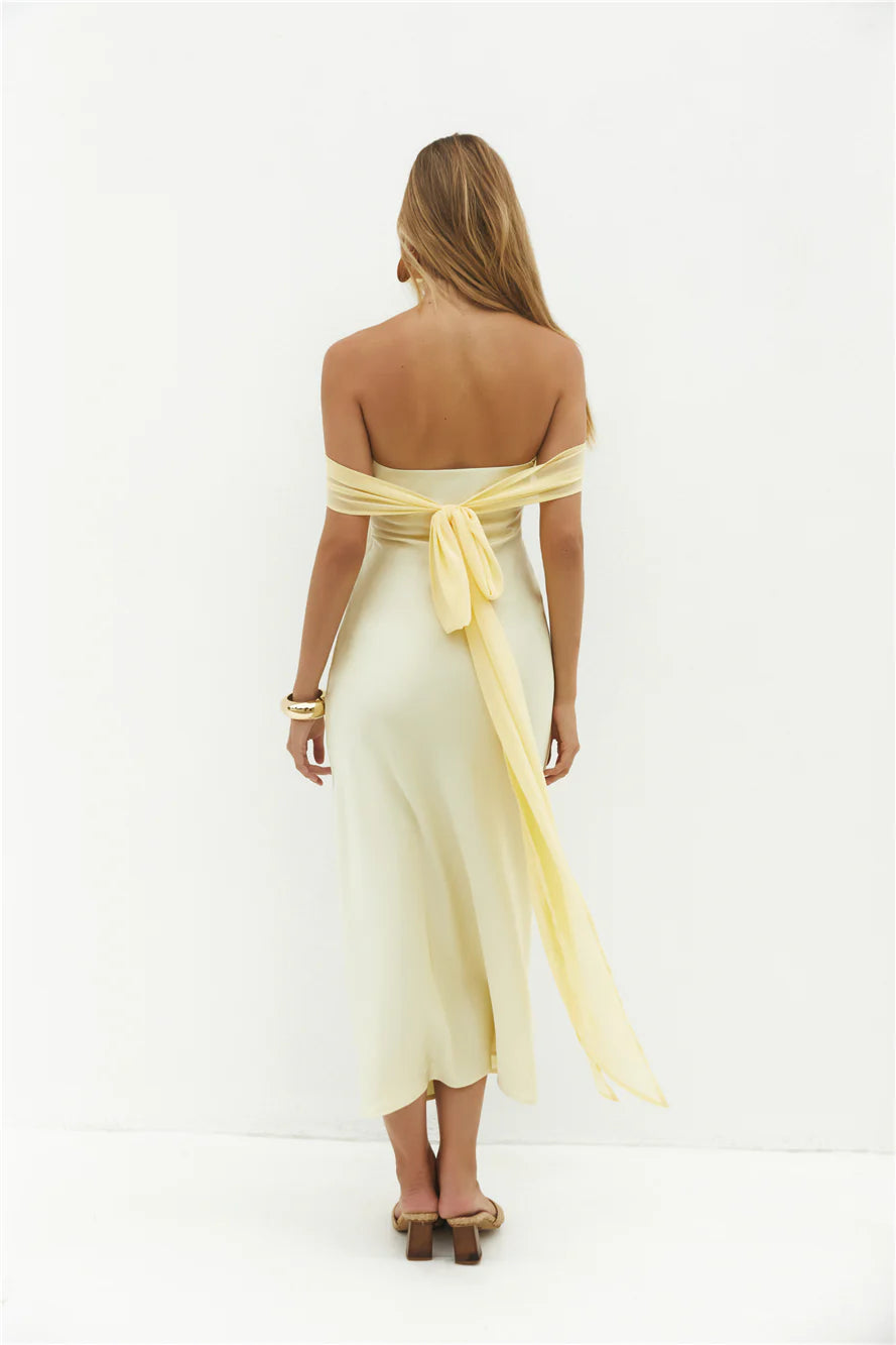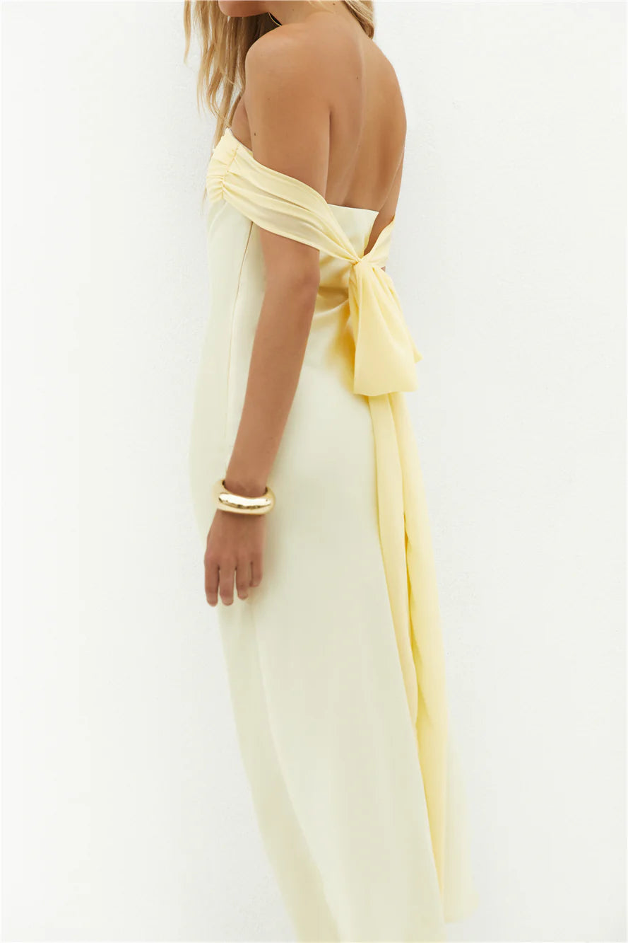 Exuding graceful sophistication, the Cleo Cove Strapless Maxi Dress in Butter yellow, wants you to embrace the carefree beauty of the season. Crafted in a soft, sky-blue hue, this dress features a delicate off-the-shoulder silhouette with a twist-front detail for a modern, feminine allure.