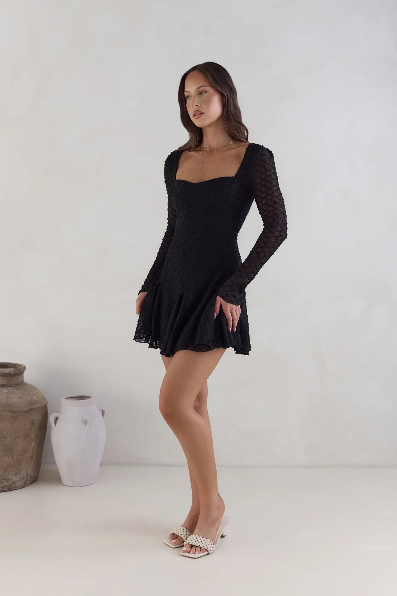 Float through your day and night in the Drift And Dream Long Sleeve Mini Dress Black. Crafted from textured stretch fabric with a flowy skirt, this slip-on dress blends effortless comfort with a touch of romance. Long sleeves add a graceful finish, making it your perfect companion for city escapes or dreamy evening strolls.