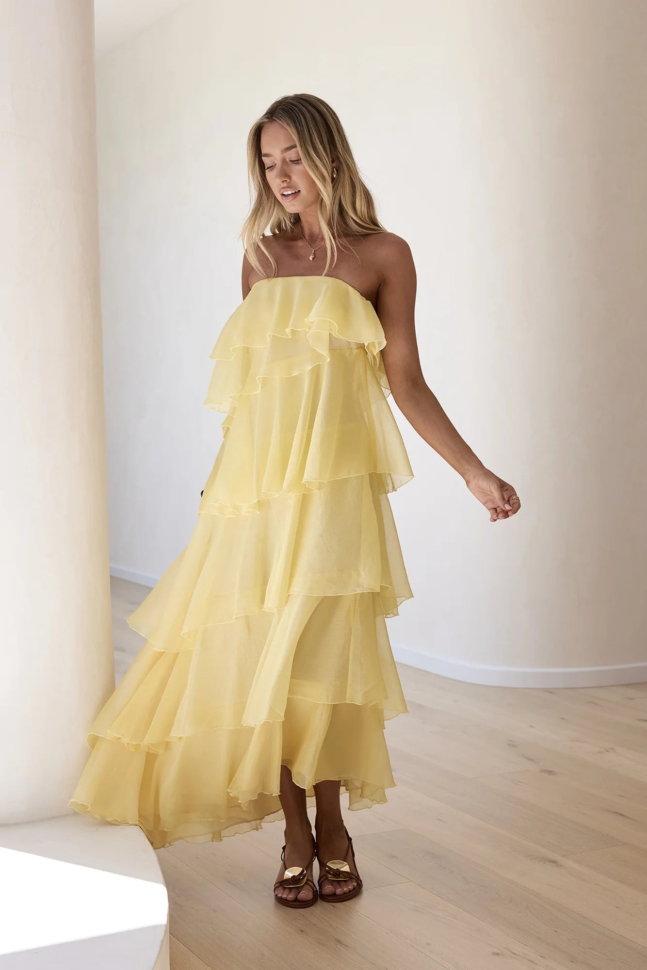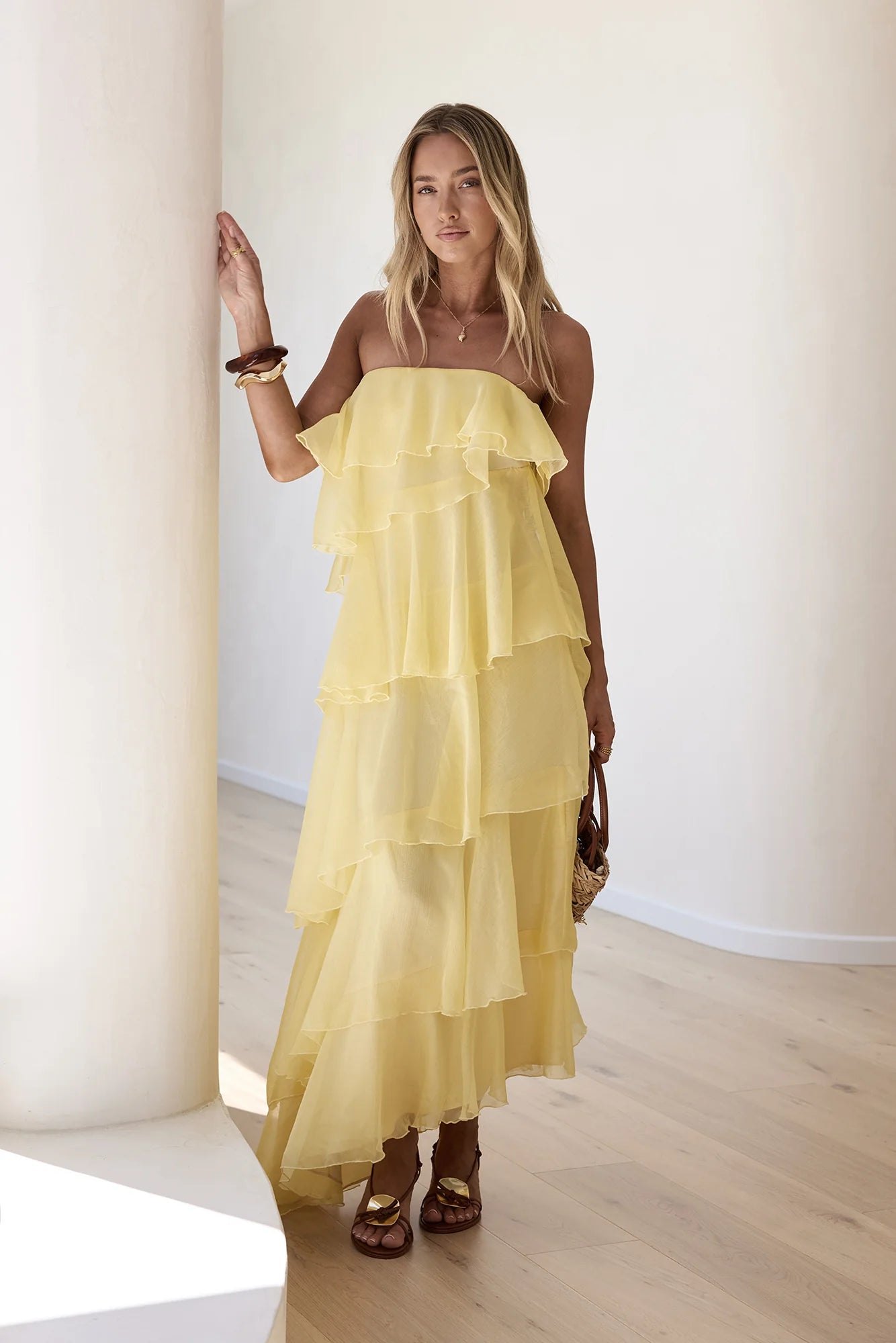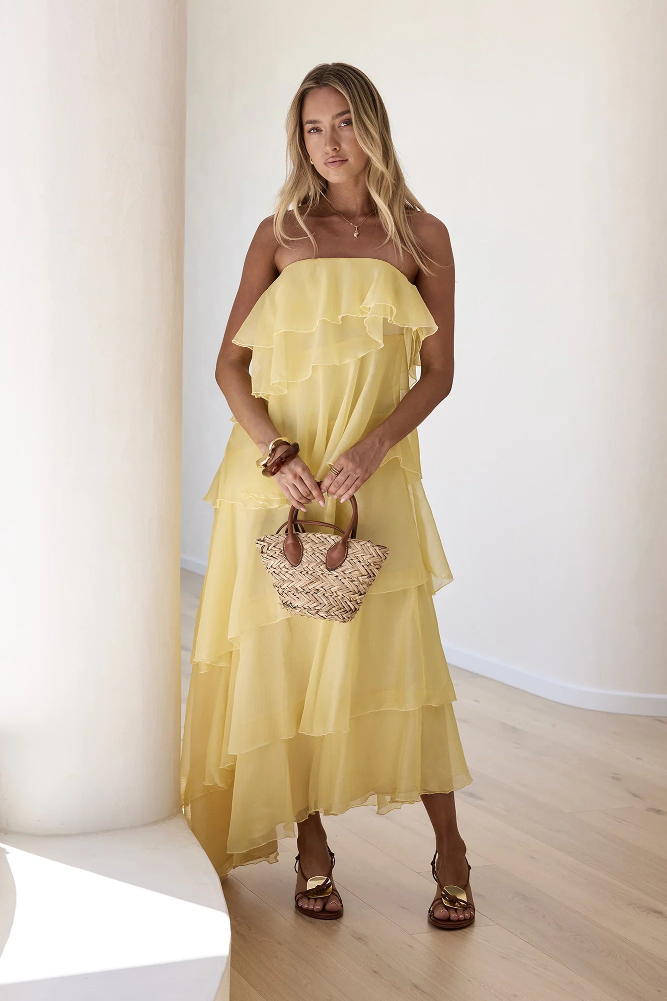 Glow in the Drop Of Sun Strapless Maxi Dress, a statement silhouette perfect for your next event under the sun and by the shore. A strapless design featuring an asymmetrical, tiered construction, you'll be sure to turn heads in this bold and beautiful dress. Style with mules and gold jewellery.