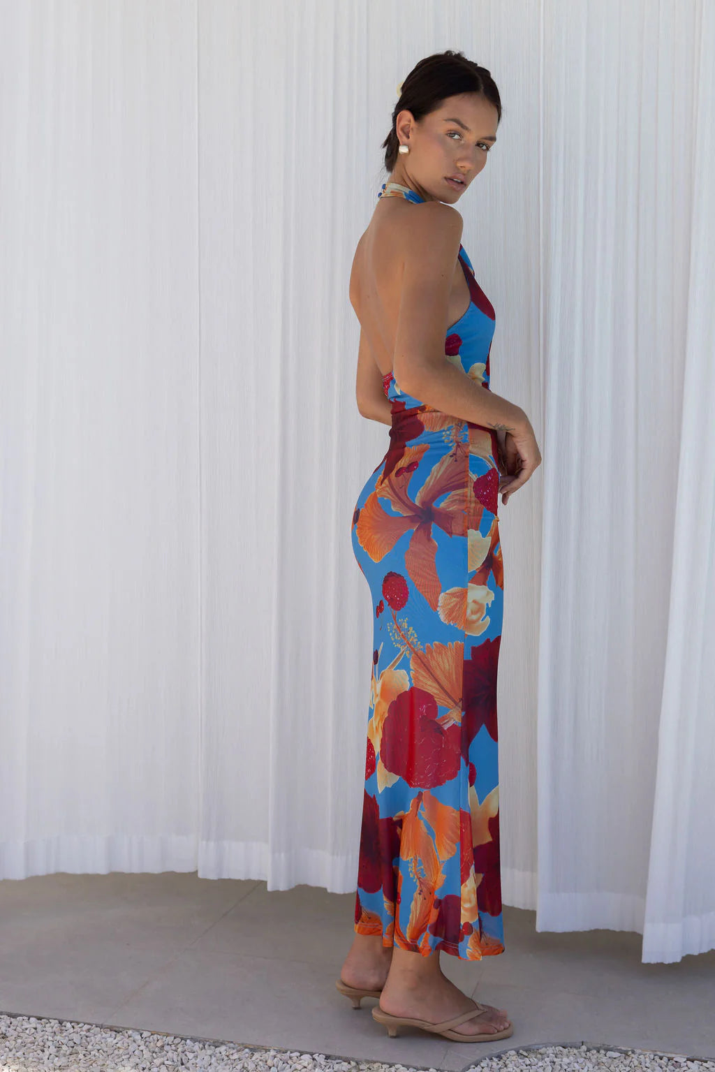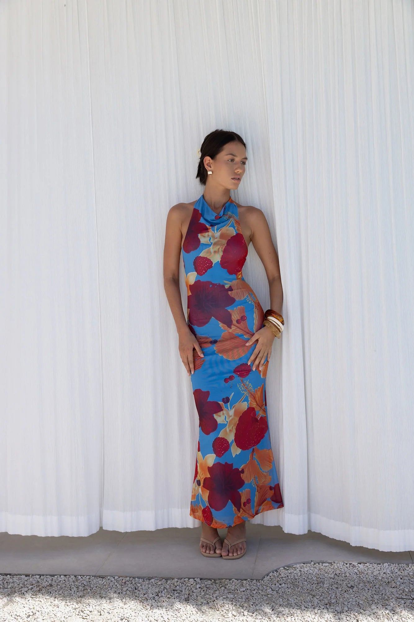 Turn heads in the Endless Voyage Maxi Dress Blue, featuring stretch mesh, a halter neckline, and a playful print—perfect for summer soirées or stylish daytime events.