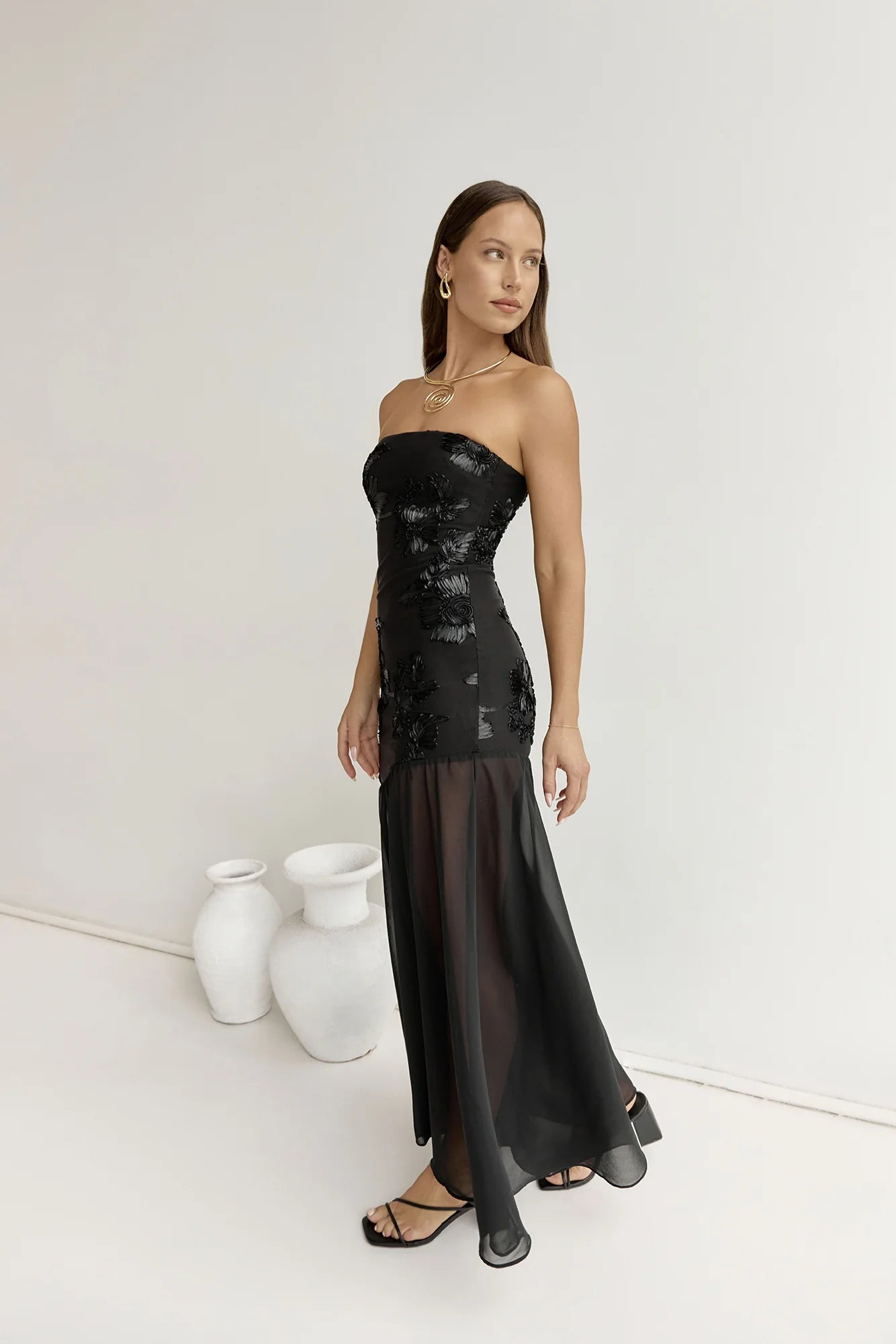 The First Class Feelings Strapless Maxi Dress features a stretchy mesh bodice with intricate embroidered details, and a sheer flowy skirt, creating an effortlessly elegant look. Style with heels.