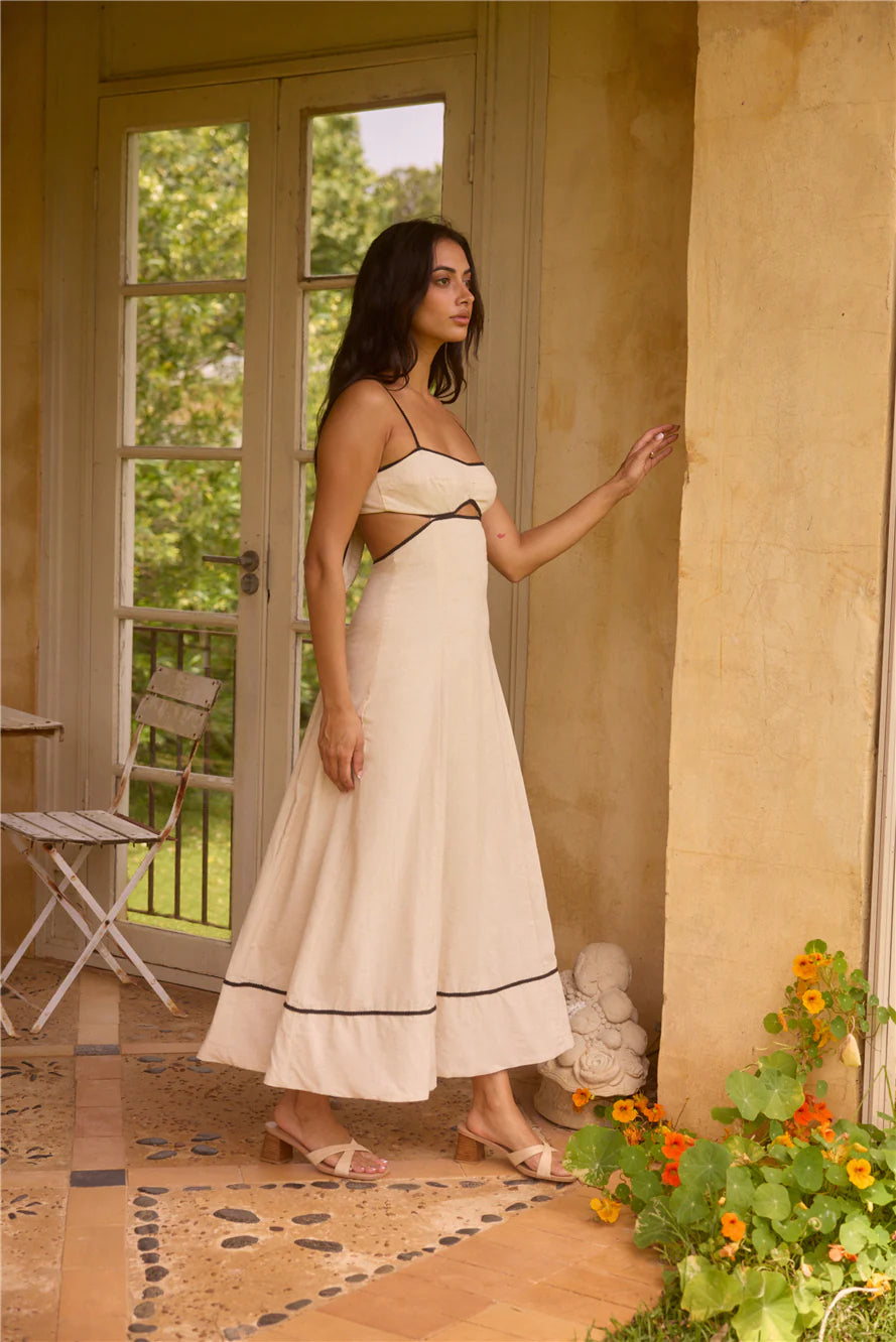 The Floating Orchid Maxi Dress in white is a show-stopping choice for any occasion, combining elegance with a touch of modern flair. Featuring a bralette-style bust and a gracefully flowing skirt, this dress creates a beautifully flattering silhouette that moves with you. The black outlining adds a striking contrast to the crisp white fabric, giving this maxi dress a unique and eye-catching edge. Perfect for everything from garden parties to evening events, the Floating Orchid Maxi Dress can be effortlessly styled up with heels and jewelry or down with simple flats for a more relaxed look.