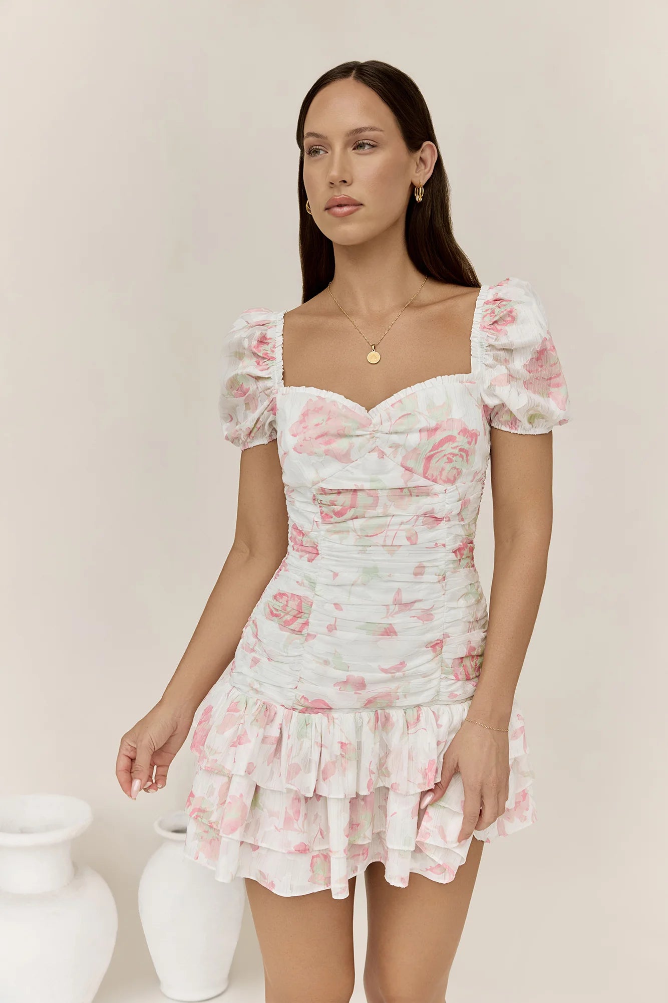 Step into a romantic moment with the Flora’s Dream Mini Dress by Hello Molly, featuring a delicate frill neckline, dreamy elastic puff sleeves, a flattering gathered bodice, a tiered frill skirt, and a subtle silver pinstripe for a hint of shimmer! Style with kitten heels and gold adornments for your next spring event.