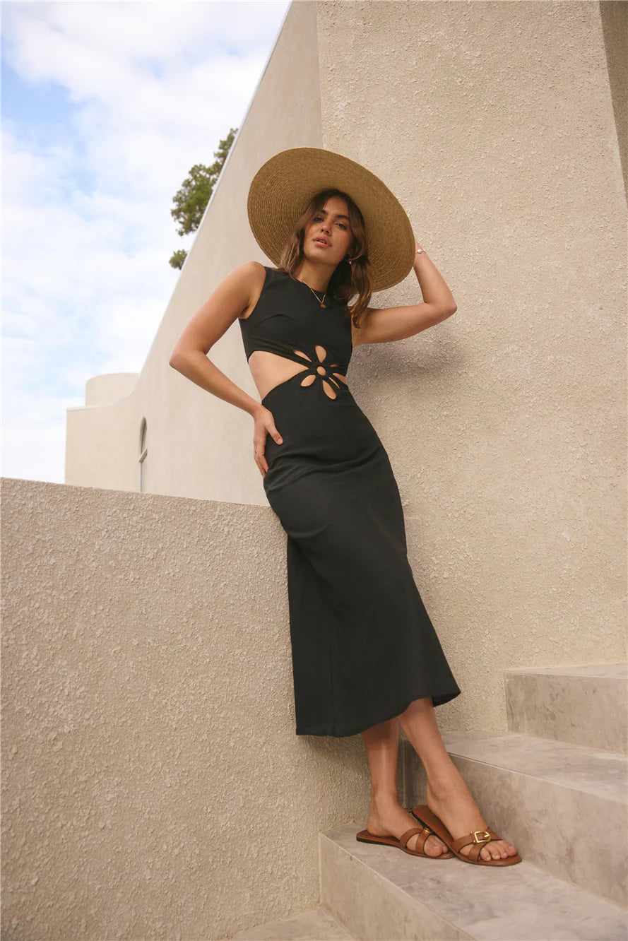Enjoy carefree memories and the summer wind flowing through in the Fluttering Hearts Maxi Dress in Black. Pair this flowy, lightweight piece with white sandals and loose waves for the perfect summer attire.