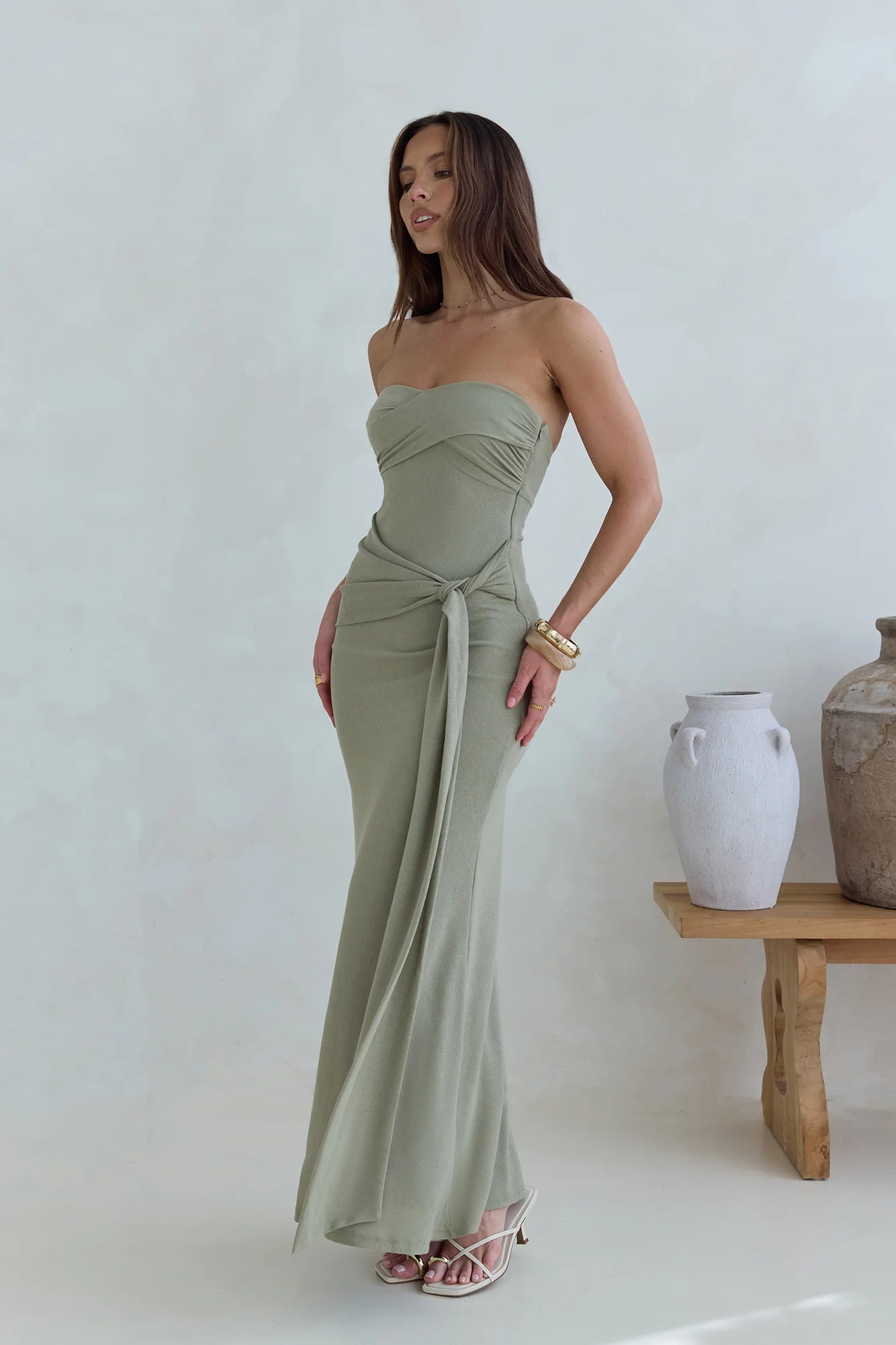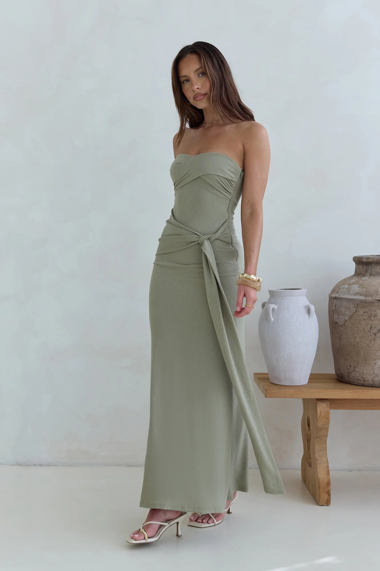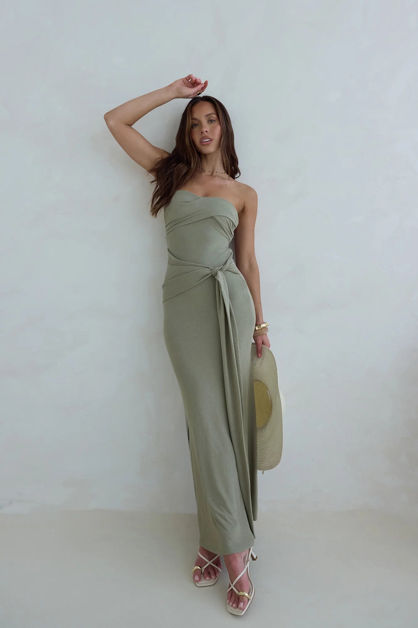 Fall under a spell in the Follow You Strapless Maxi Dress, a lush silhouette perfect for celebrations under the sun. A statement strapless design made in a soft, stretch knit fabric, style with mules and a woven bag for an effortless summer look.
