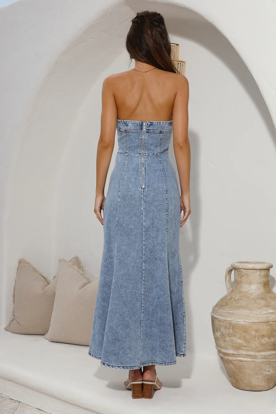 The For The Record Maxi Dress in Denim is a statement piece in your wardrobe. Style with white boots and gold adornments.