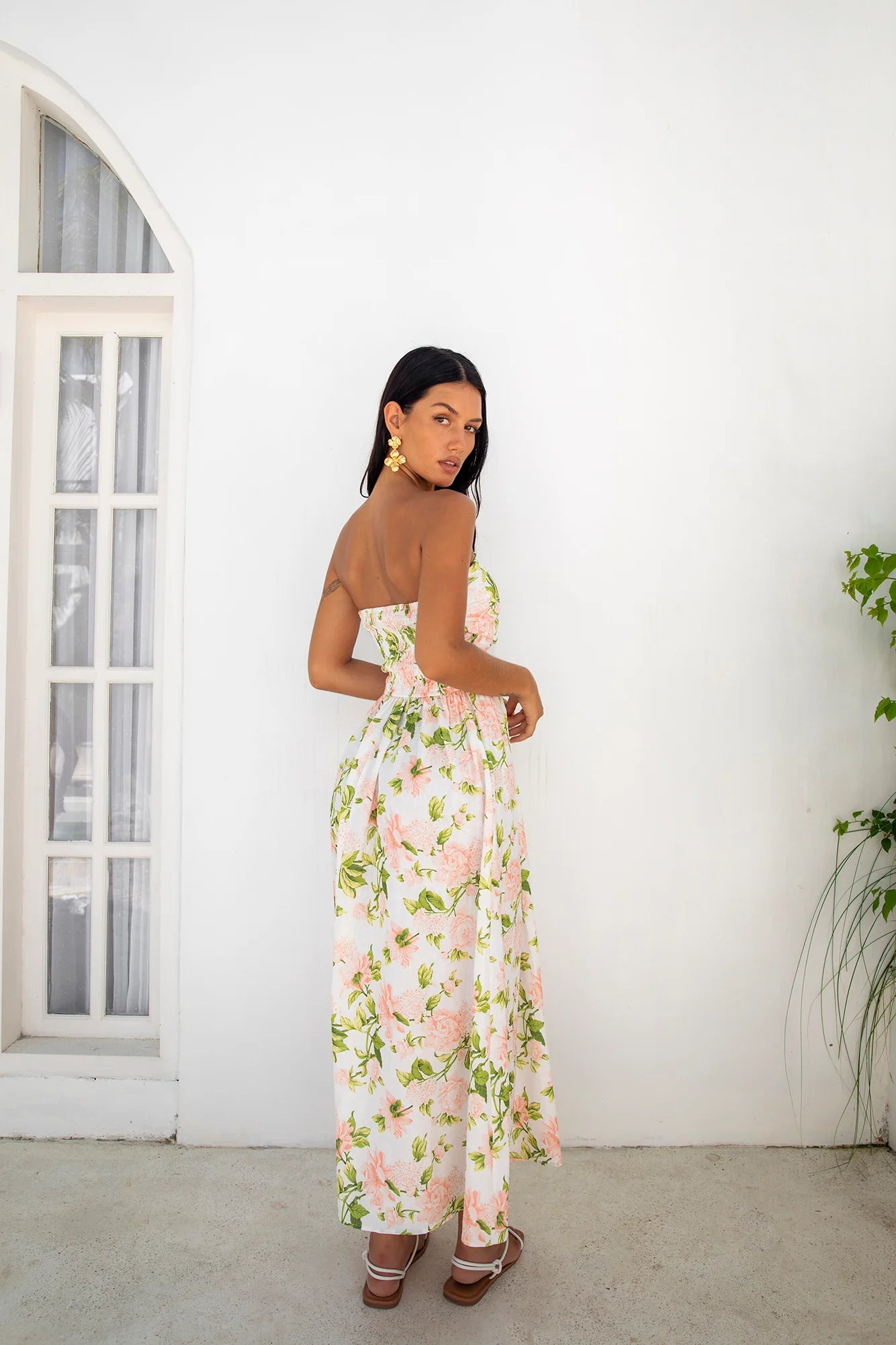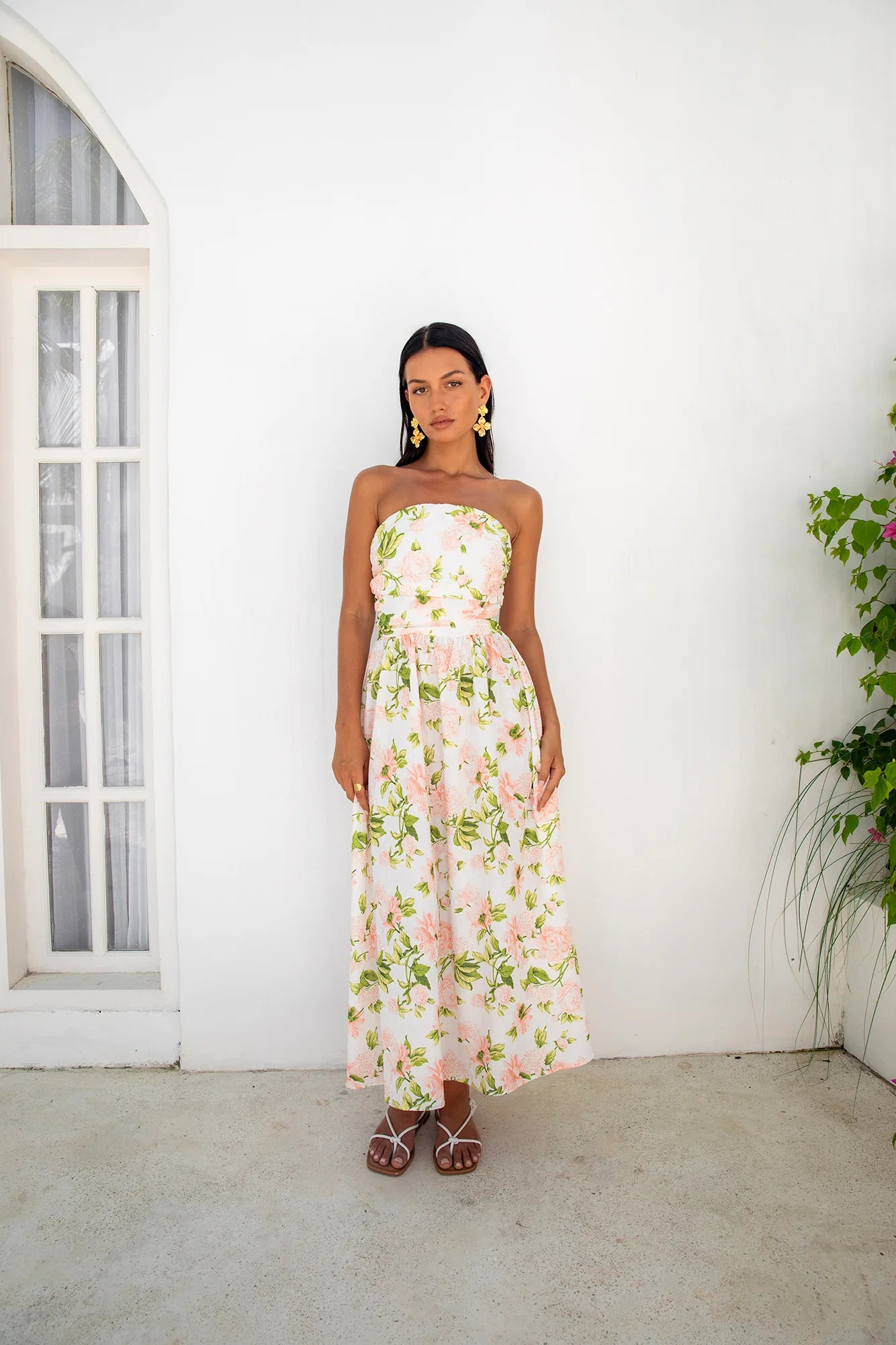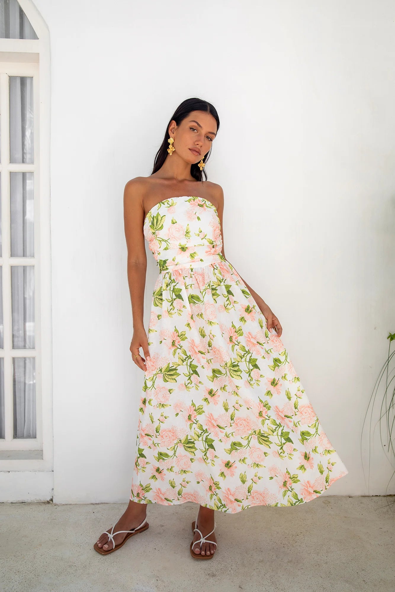 Make a statement with our Exclusively Designed, FORTUNATE ONE Bellissima Strapless Maxi Dress in Pink. This elegant, strapless dress features a flowing silhouette and vibrant hues, perfect for adding a touch of glamour to your summer soirées.