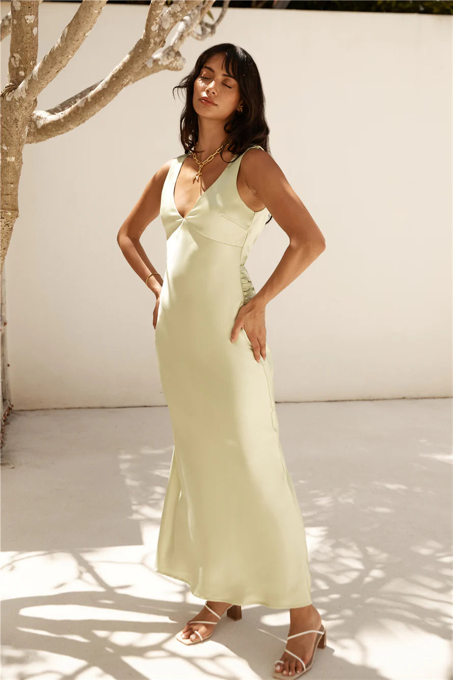 Embrace the epitome of grace with our Freshen Up Satin Maxi Dress in Green. Picture yourself, drink in hand, swaying to the rhythm of a live band beneath a night sky adorned with stars. Cherish every moment ahead as you adorn yourself in this dress, a perfect blend of elegance and allure.