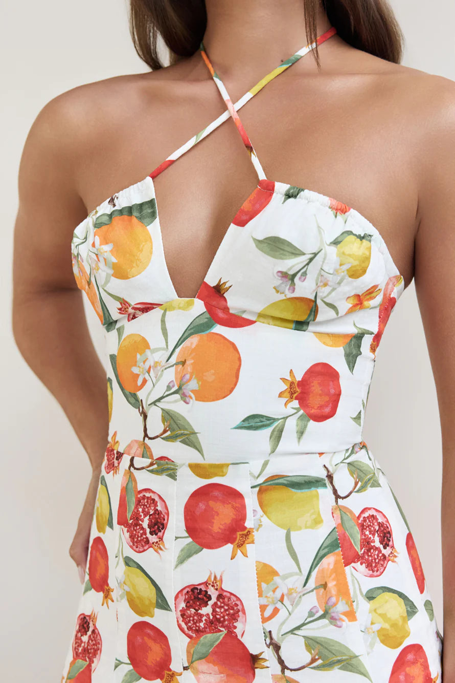 Fun and sun-kissed, the Fruits Of Summer Mini Dress is made for warm days and breezy nights. Featuring a flirty halterneck with elastic detail to the neckline, a soft flowy skirt, and a vibrant fruit print, it's your go-to for effortless summer style. Style with sandals for your next day under the sun.