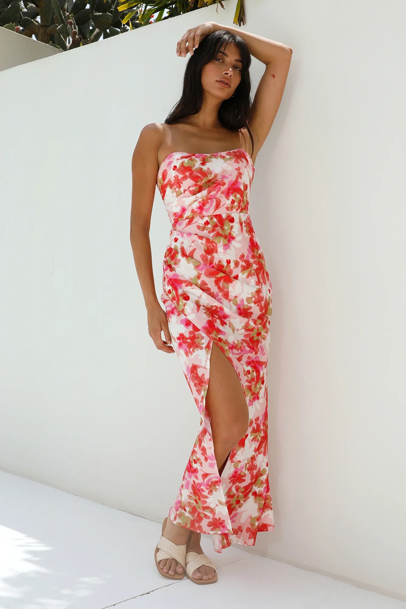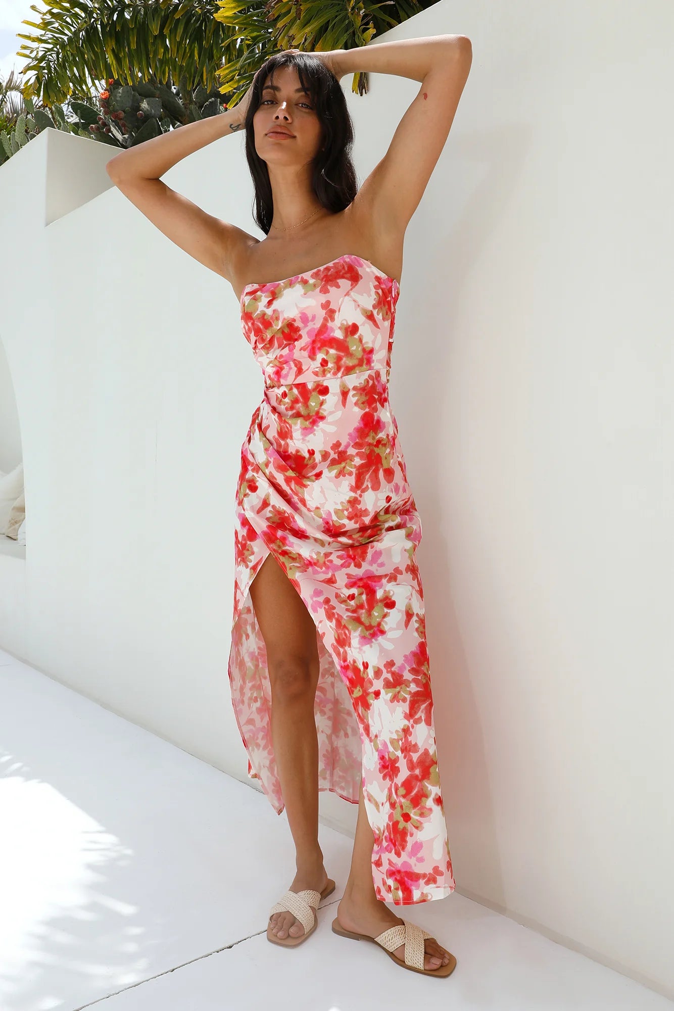 Vacation in style with the Gardenia Strapless Maxi Dress in Red. With a flowy silhouette and a fun print, you'll be sure to turn heads. Style this dress with tan strappy heels and loose waves to complete the look.