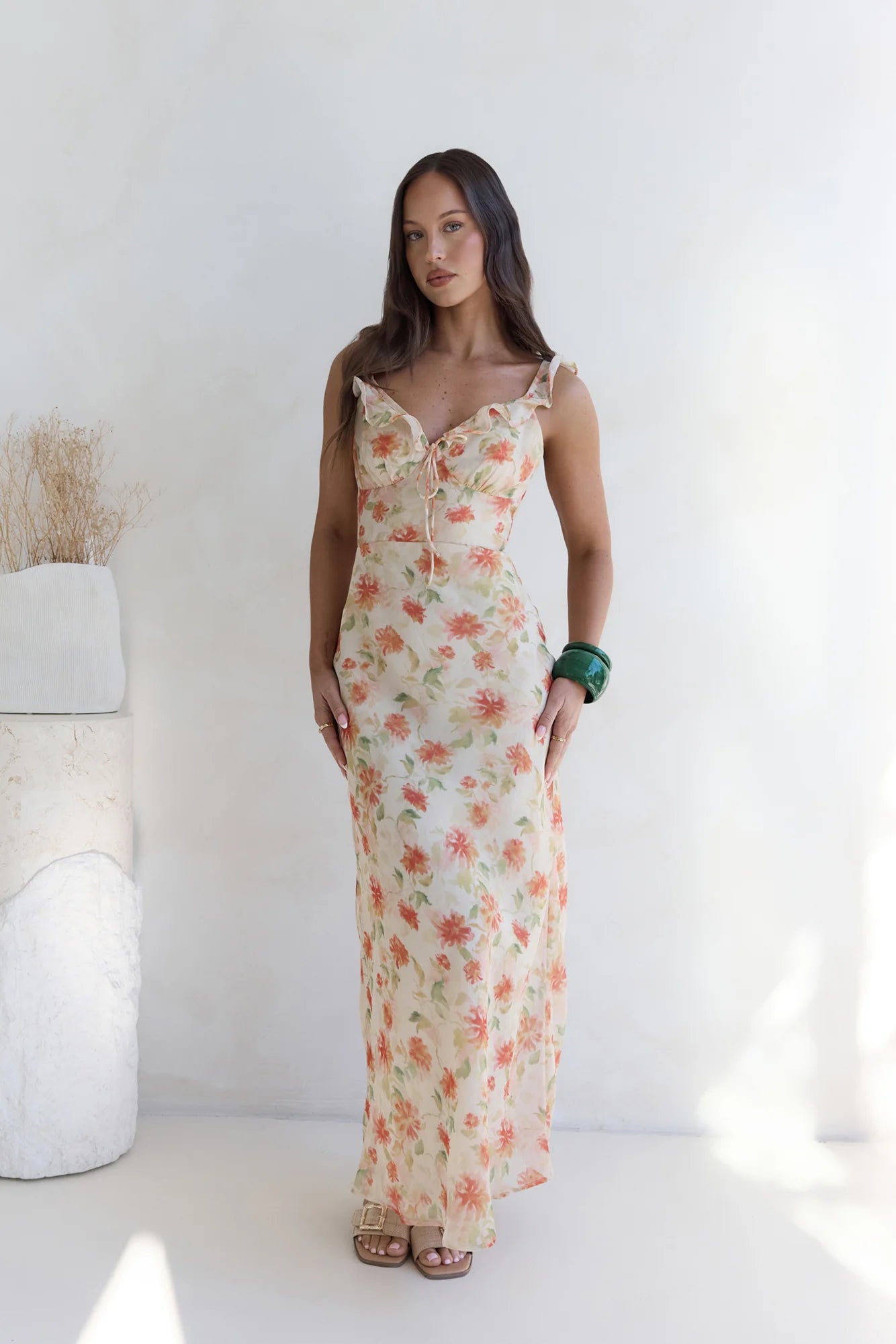 Step into sunshine with the Glimmer Glide Maxi Dress. This stunning maxi features playful frill shoulders and a fun print that brings a burst of energy to any occasion. The tie neckline adds a charming touch, while the fully lined, non-stretch fabric ensures a graceful drape and comfortable fit. Perfect for days when you want to shine from morning till night.
