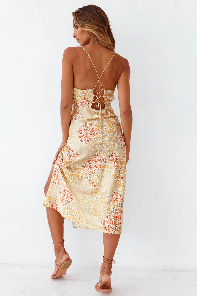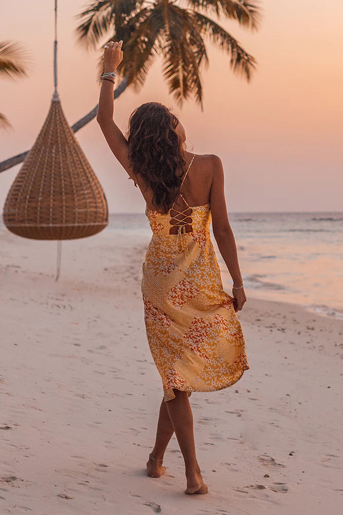 Live the Malta life anywhere you go with our Golden Rivers Midi Dress! We're styling ours with slides and a woven bag.