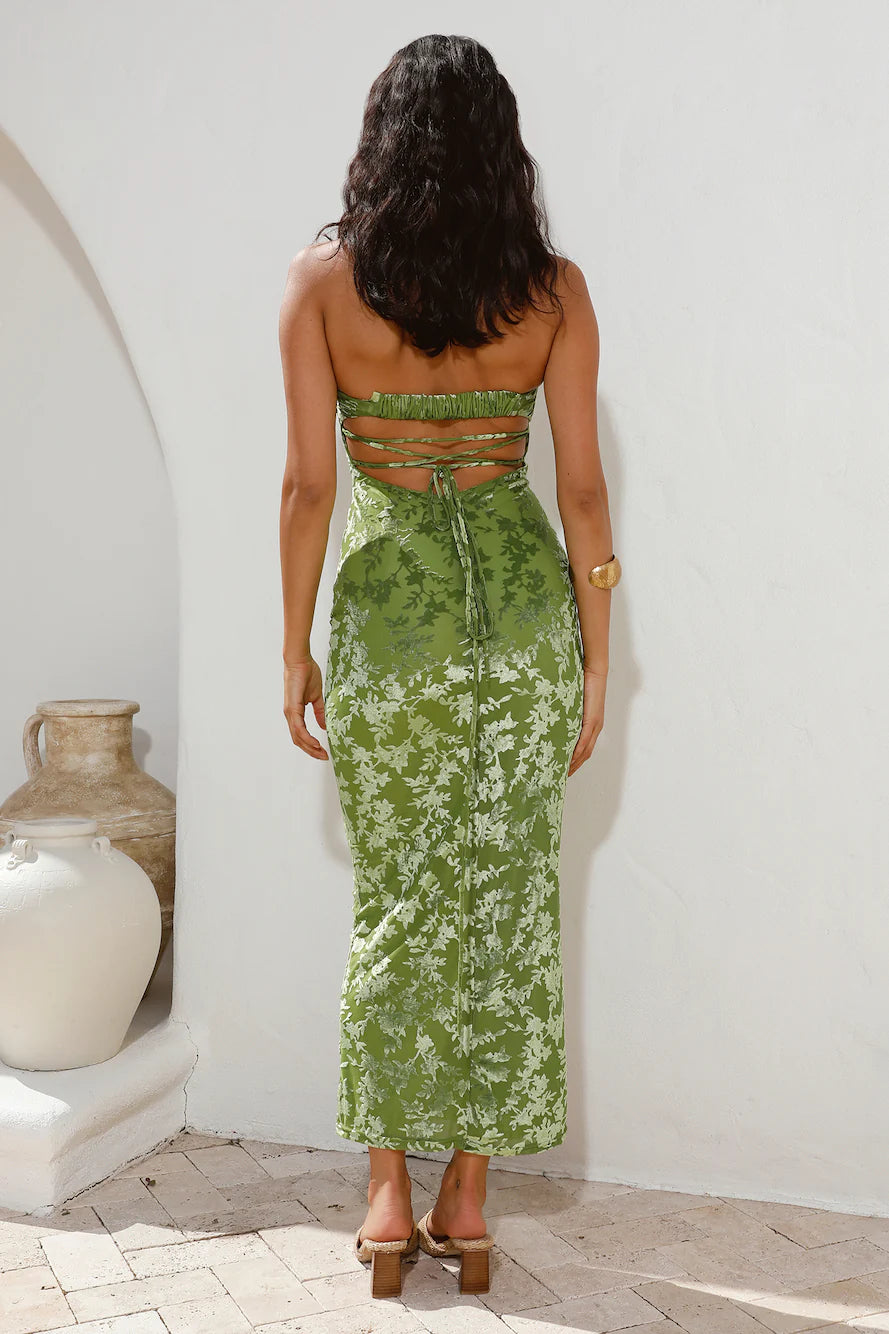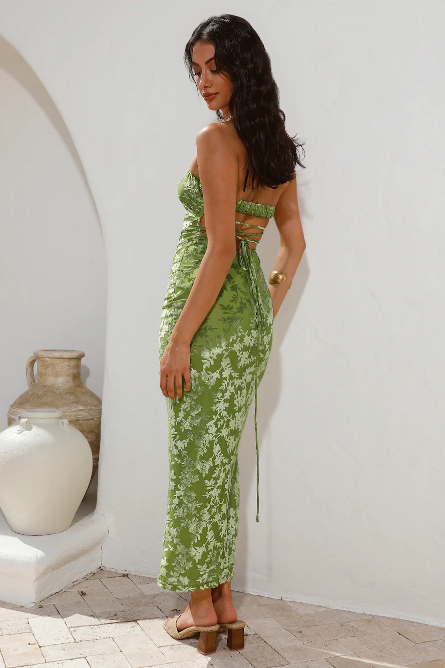 Experience your dream destination in style in the Grass Is Greener Maxi Dress in Green. Style with white heels and gold adornments.