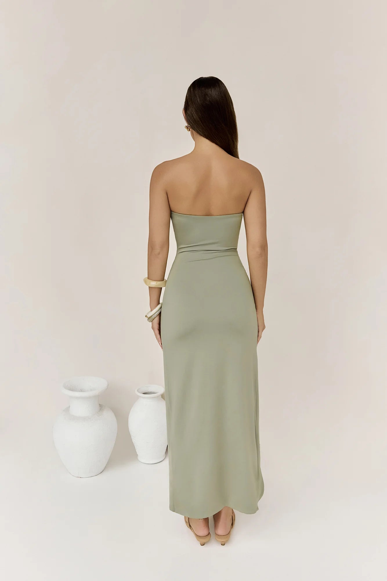The Heading Out Strapless Midi Dress in Olive is the ultimate cocktail statement piece. Featuring an elegant strapless design, this dress is elevated by stunning stone-wired detailing across the top of the bust, adding a unique and glamorous touch. The daring leg slit and flattering ruched side detailing create a silhouette that’s both bold and sophisticated. Perfect for cocktail parties or evening events, this head-turning midi dress will have you feeling confident, chic, and ready to steal the spotlight.