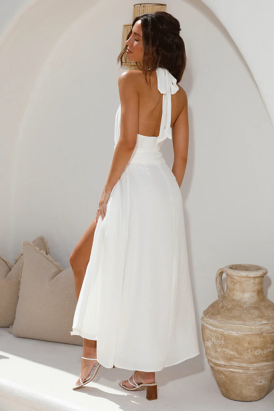 Experience the culture of Athens in the Heaven Can Wait Maxi Dress in White. This dress pairs well with beige sandals and matching gold adornments.