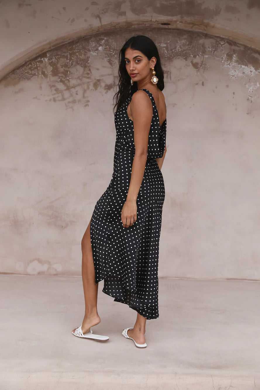 Made for the summer nights overlooking the Santorini seas, the Dotted Moment Satin Midi Dress by HELLO MOLLY will make all of your dreams come true. Style yours with neutral mules and gold adornments for an effortlessly glowy look.