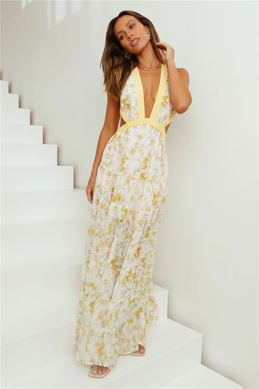 Explore the flora of your holiday destination in the HELLO MOLLY Fashion Forward Maxi Dress in Yellow. Perfect for strolling around town or styling up for a night out.