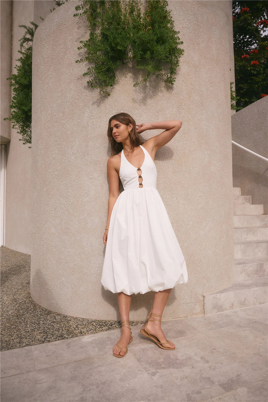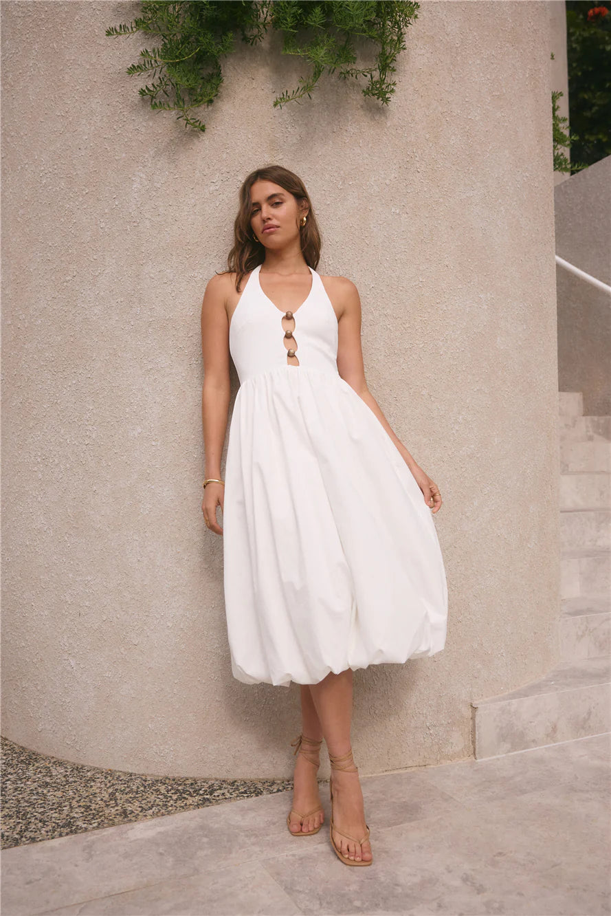 The High Tide Halter Midi Dress in White exudes coastal elegance and breezy sophistication, perfect for beachside brunches in Malibu or yacht parties in the French Riviera. Embrace summer's allure with this chic dress, designed for effortless style and timeless charm.