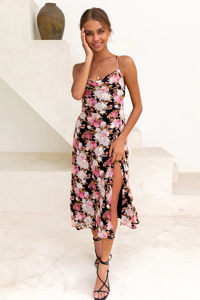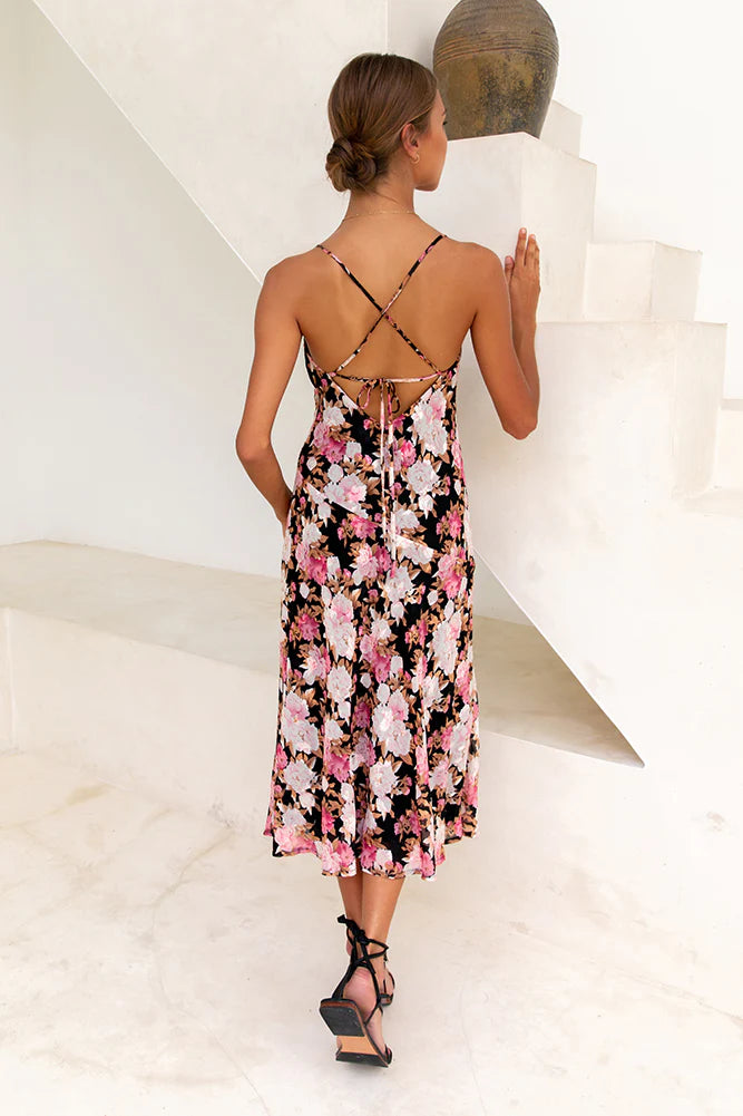We're dreaming of restaurant dates by the ocean and enjoying the breeze in our Imparlour Midi Dress! Style this floral statement with neutral heels and gold jewellery.