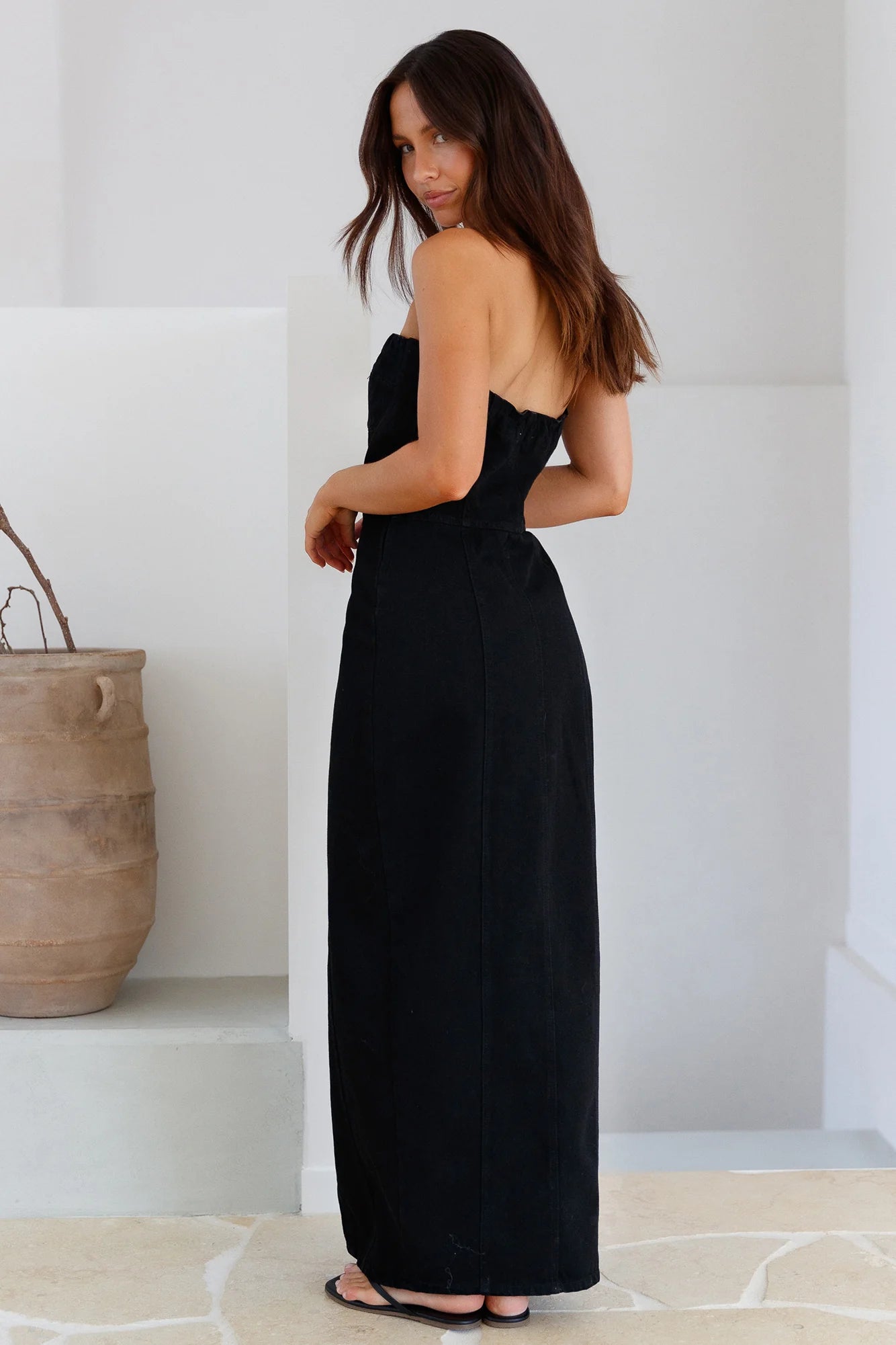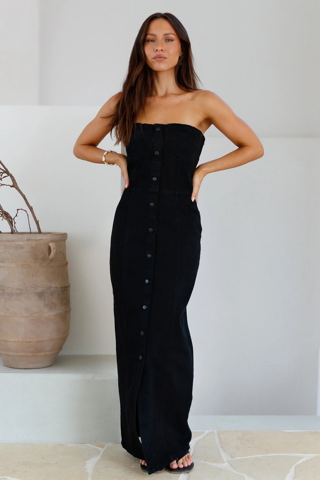 The Into The Classics Maxi Dress in Black is a sleek denim dress, perfect for your next event. Style with tall black boots and silver adornments.