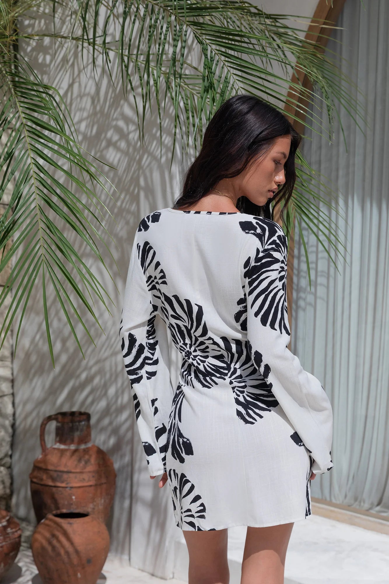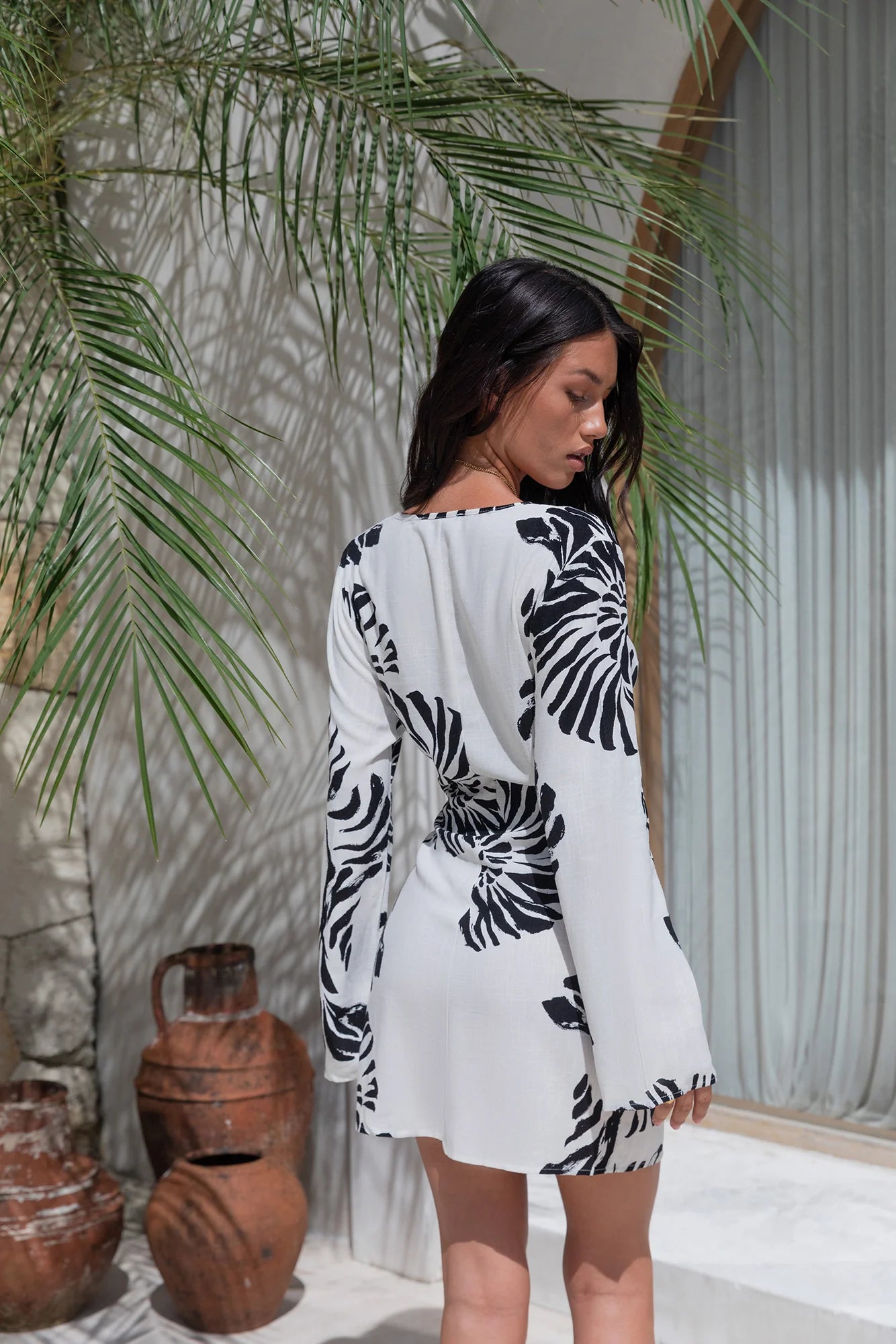 Slip into something that feels like a holiday. The Island Time Only Mini Dress features a relaxed wrap style with a tie waist, flowy long sleeves, and a soft all-over print that brings those coastal daydreams to life. Unlined and easy to wear, it’s the kind of dress that goes from beachside mornings to sunset nights.