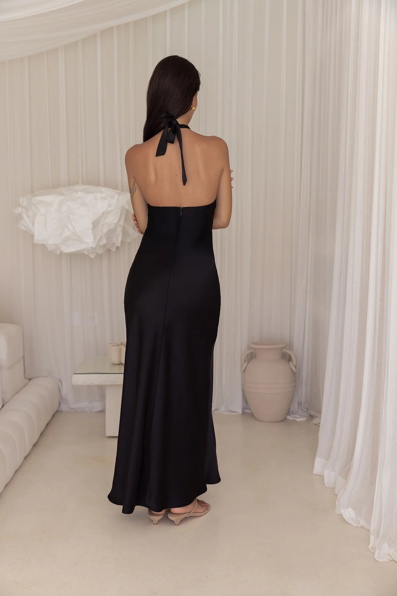 Shine all night in the Jet Set Dreams Maxi Dress, featuring silky satin, a halter neckline, sheer bodice, and a flowy skirt—perfect for twirling through every party with elegance.