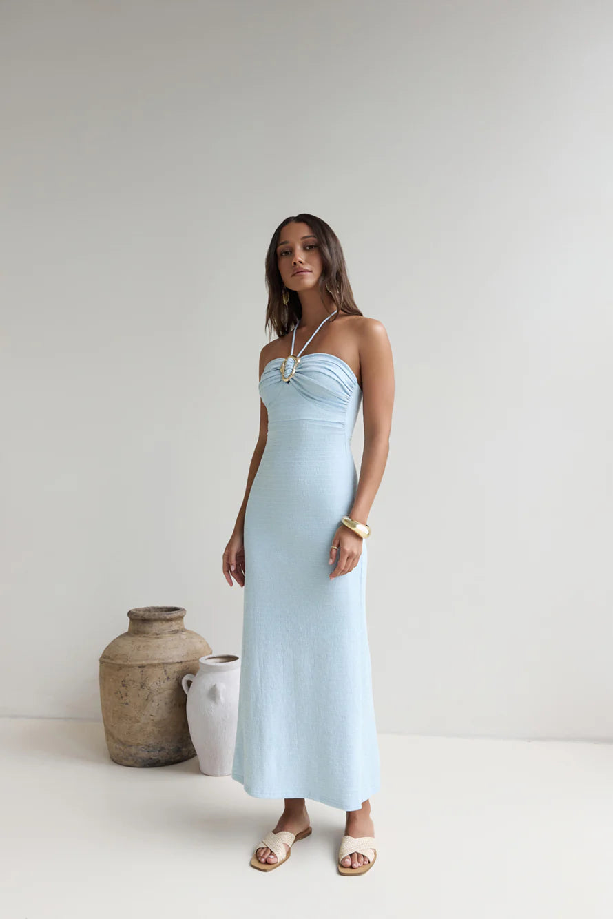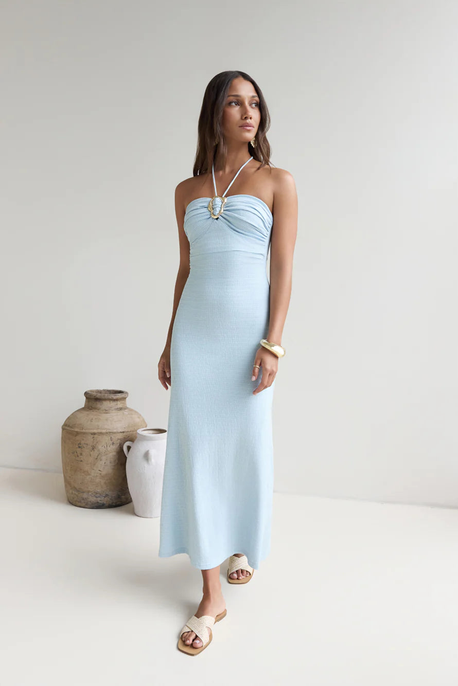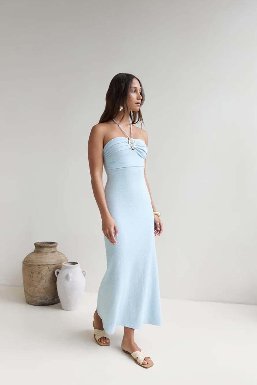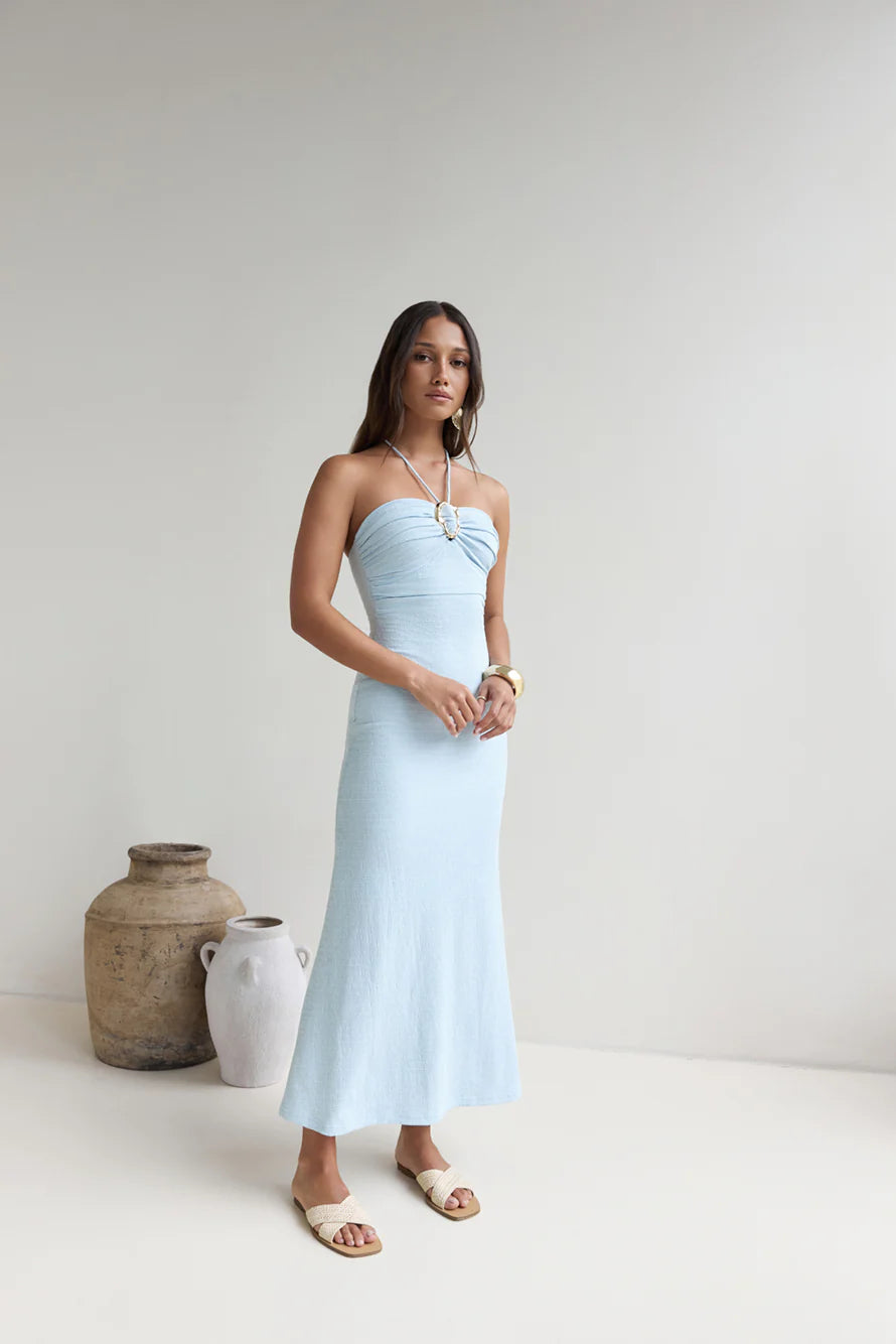 Make your dreams come true in the Karmic Blessing Strapless Halter Maxi Dress Blue, a resort-inspired piece perfect for your next escape. Style with sandals and lightly curled hair.