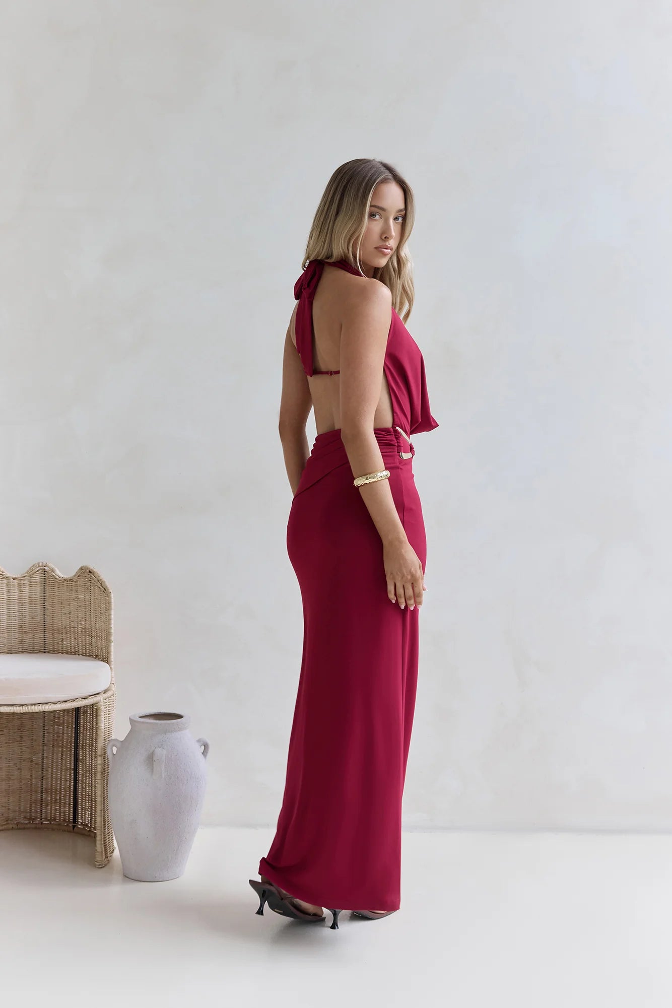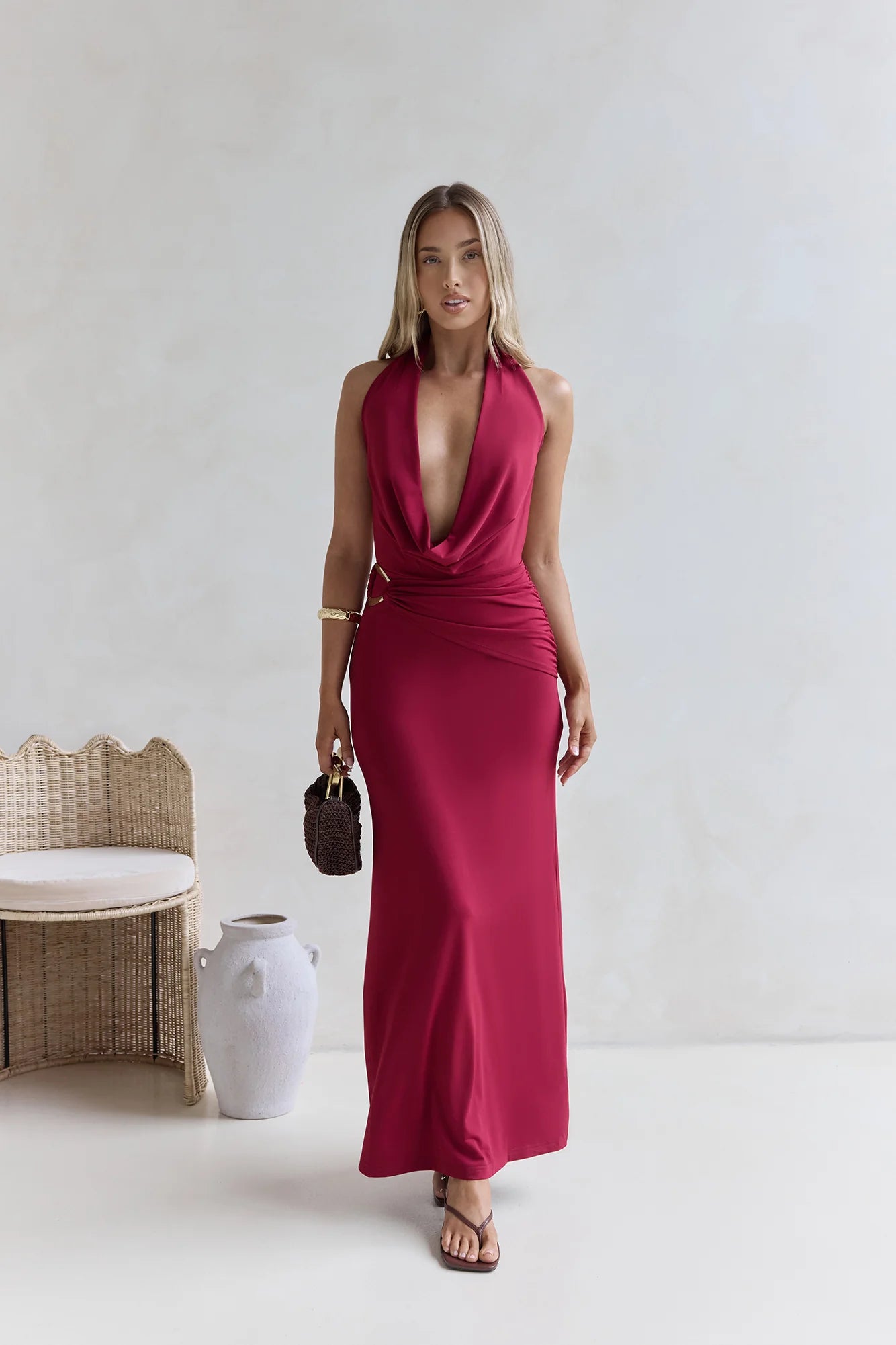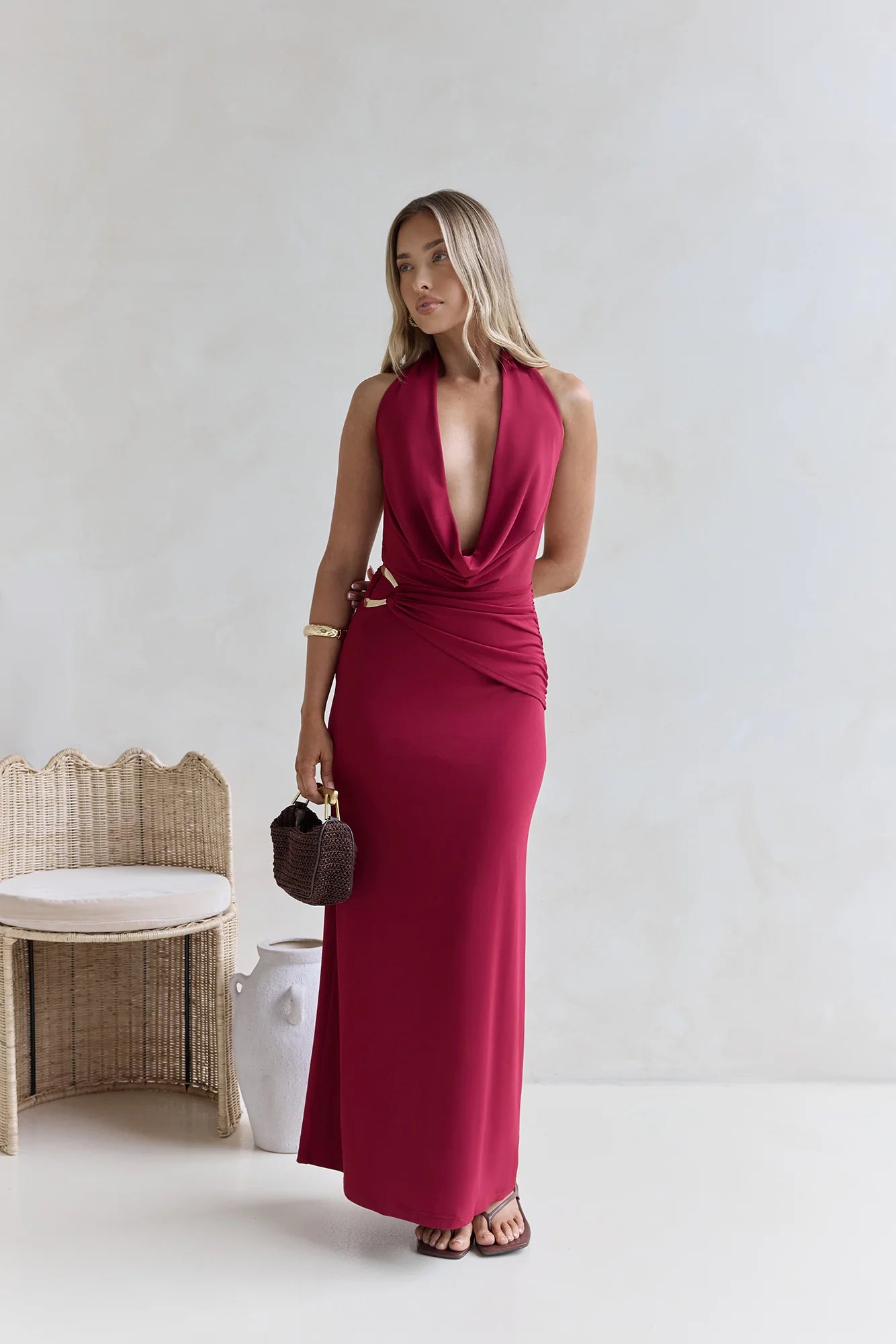 Radiate luxury in the Kiss Journeys Halter Maxi Dress, featuring a stretchy fabric, halter tie, elegant cowl neck, gold waist detail, and a stunning open back—pair it with gold strappy heels and a sleek updo for an unforgettable evening look.
