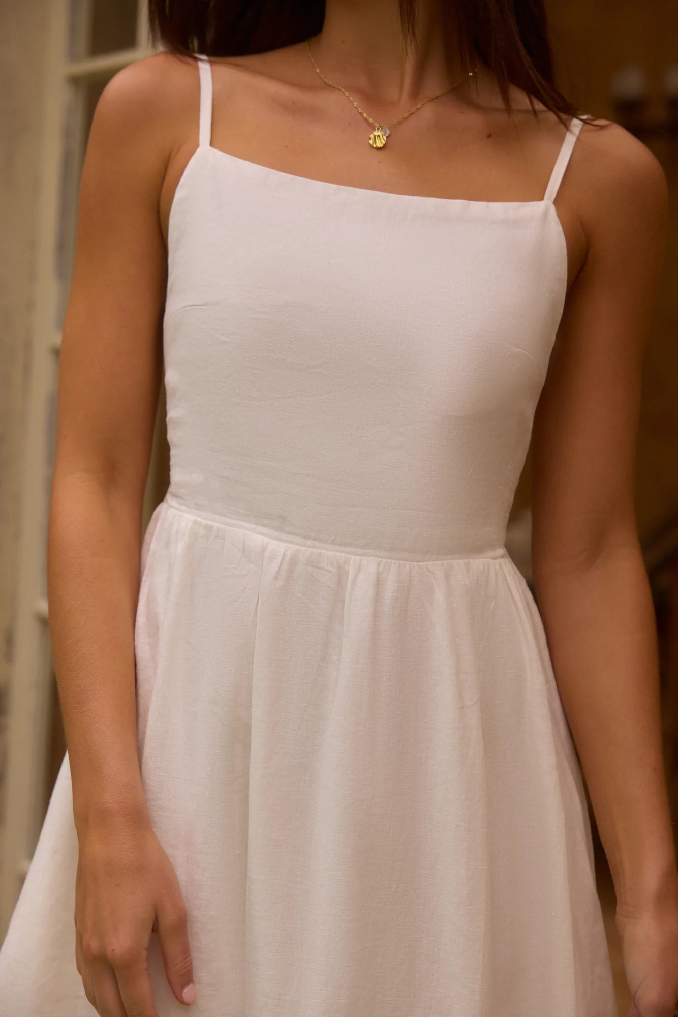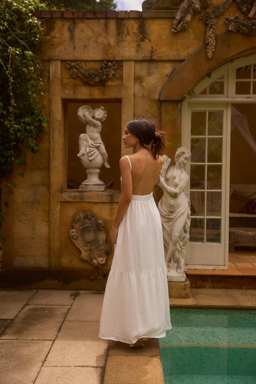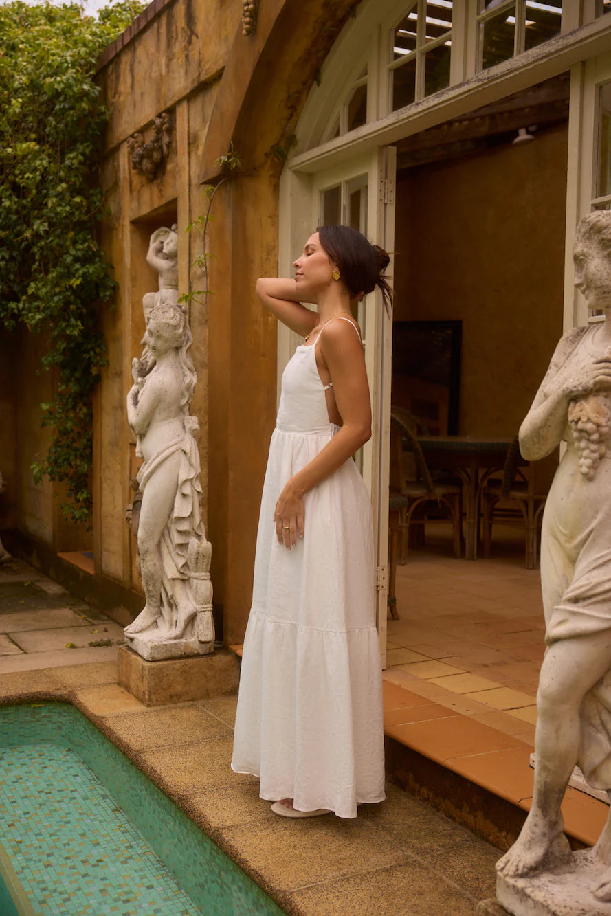 Crafted from 100% premium linen, this dress exudes a classic, feminine charm with a touch of rustic elegance. Its square high neckline and elasticated waistline create a structured yet soft silhouette, and the over-the-shoulder adjustable spaghetti straps with the cut-out back style, add a romantic, cottage-inspired touch. The flowy panneled skirt and premium linen fabric give it an effortless, breathable feel, perfect for warm-weather occasions or laid-back, yet sophisticated, styling.