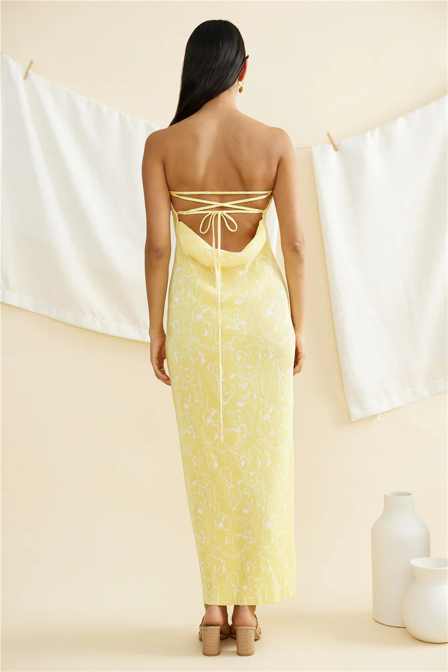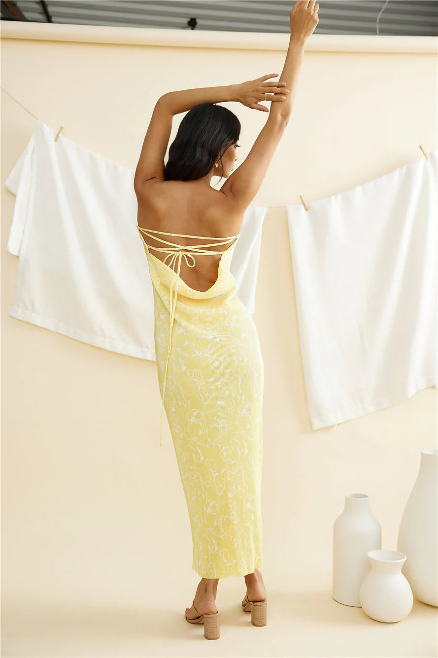 The Lemon Cello Maxi Dress will be your perfect look for a day spent by beverages and beach sounds. Soak up the sun in this stunning dress paired with beige sandals and glasses.