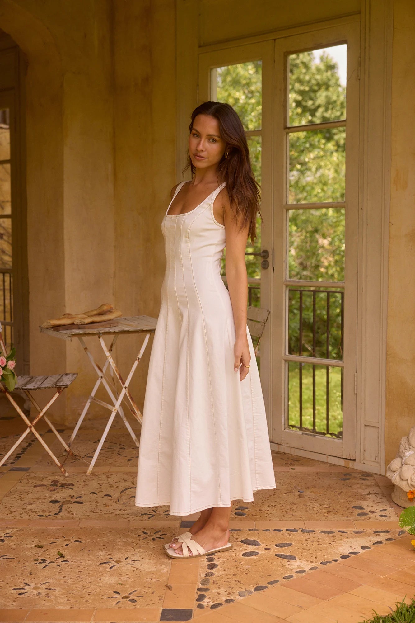 The Meadow Breeze Maxi Dress in White features a square neckline, a fitted waist, and a flowy skirt for a flattering silhouette. The brown stitching adds a unique touch of flair. Perfect for rooftop day events with friends or strolling through the streets of Rome, this dress combines effortless style and chic elegance.
