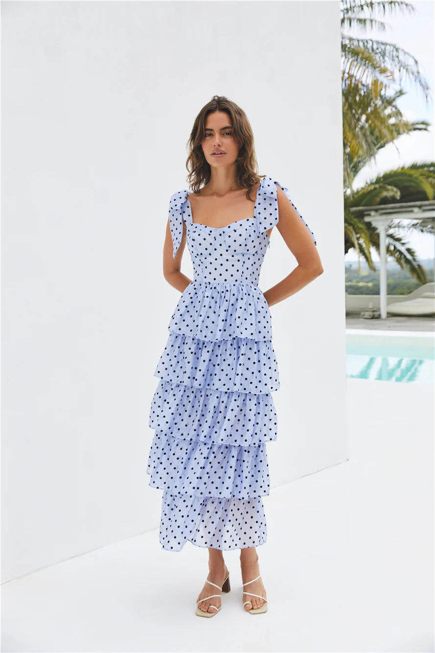 Float through sun-drenched days in our whimsical Mediterranean Muse Tiered Midi Dress. Crafted in an ethereal sky blue with playful polka dots, this romantic piece features sweet puff-tie sleeves and a flattering sweetheart neckline. The cascading tiered skirt creates effortless movement, perfect for twirling from brunch dates to beachside wanderings.