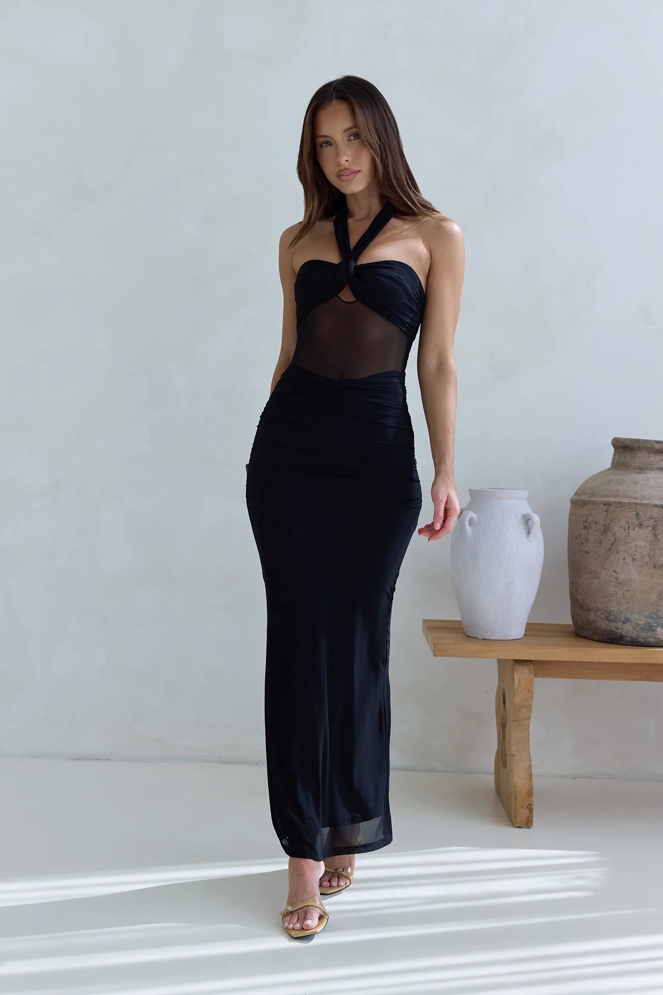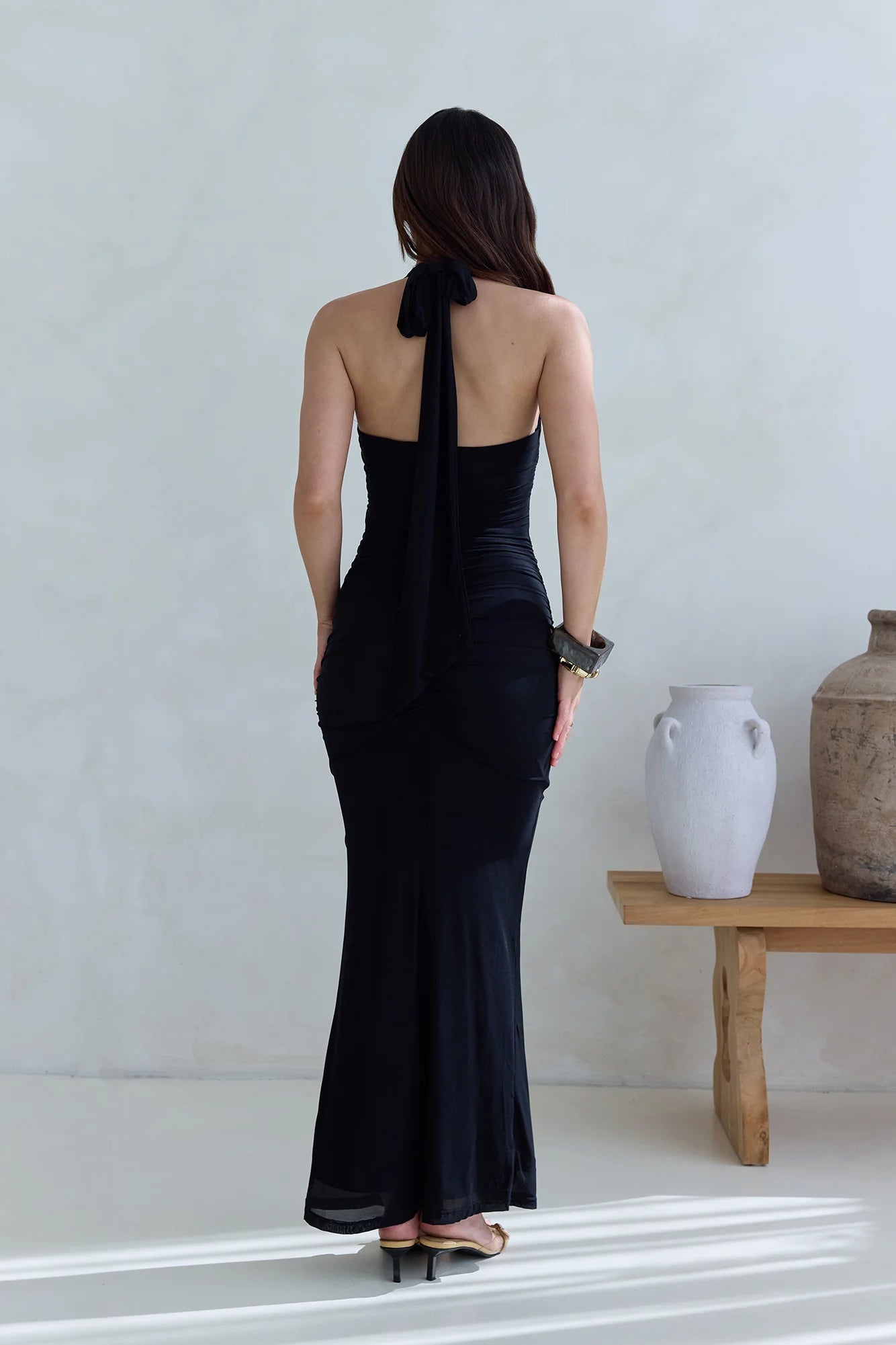 A subtle cutout at the bust adds an alluring touch, while the soft, draped fabric ensures an elegant flow with every step. Perfect for pairing with gold accents and a bold lip, this gown is your ticket to turning heads.