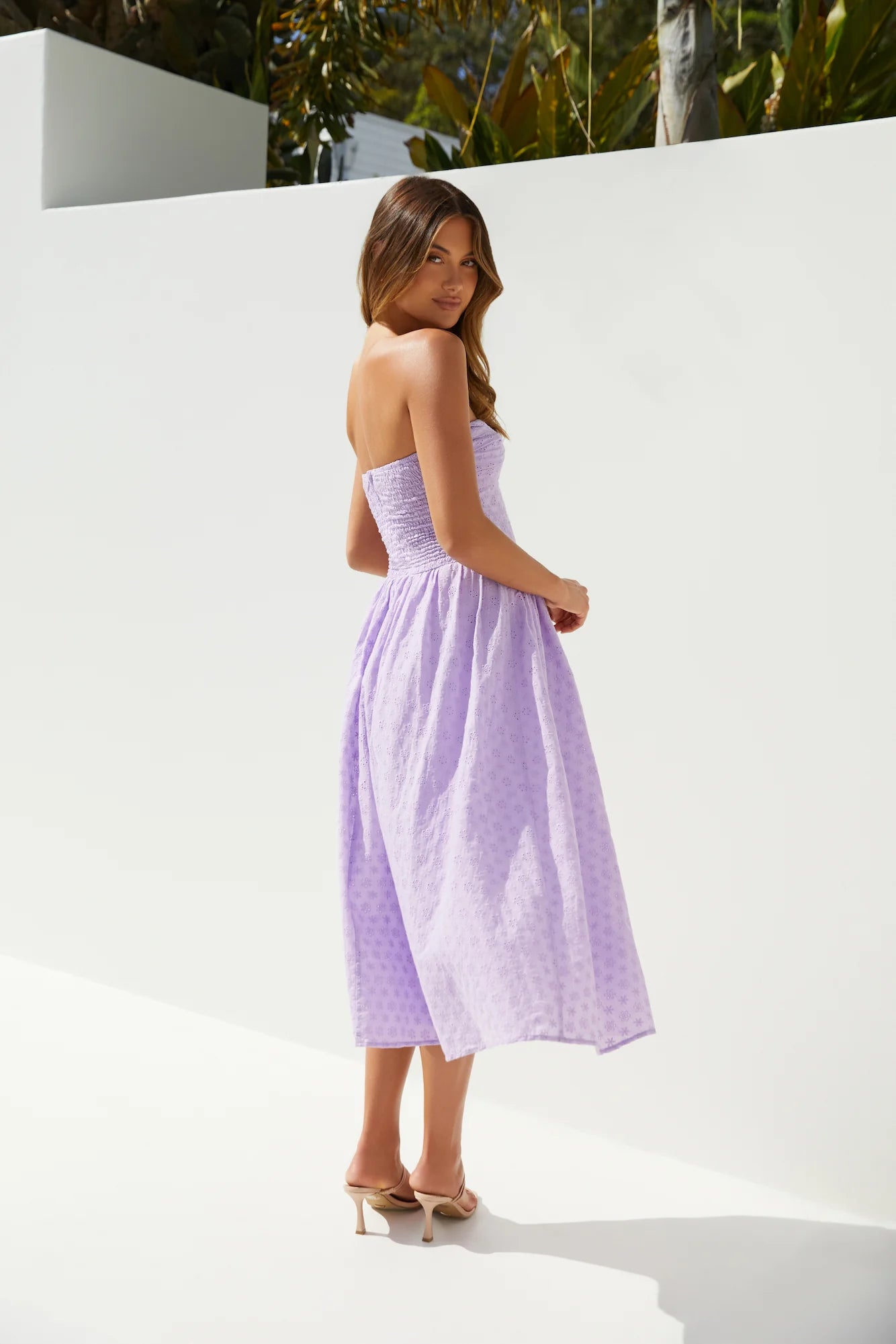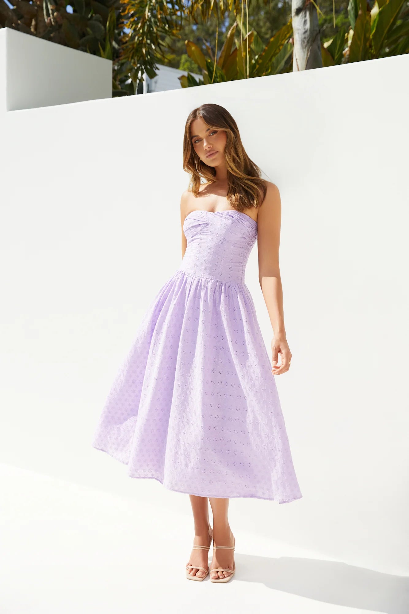 Feel like royalty in our Mimi Moments Strapless Maxi Dress in Purple. Designed to make every moment magical, this stunning dress features delicate eyelet detailing throughout, adding a touch of romance and elegance. The tulle underlay creates a voluminous silhouette, giving you that princess-like feel with every step.