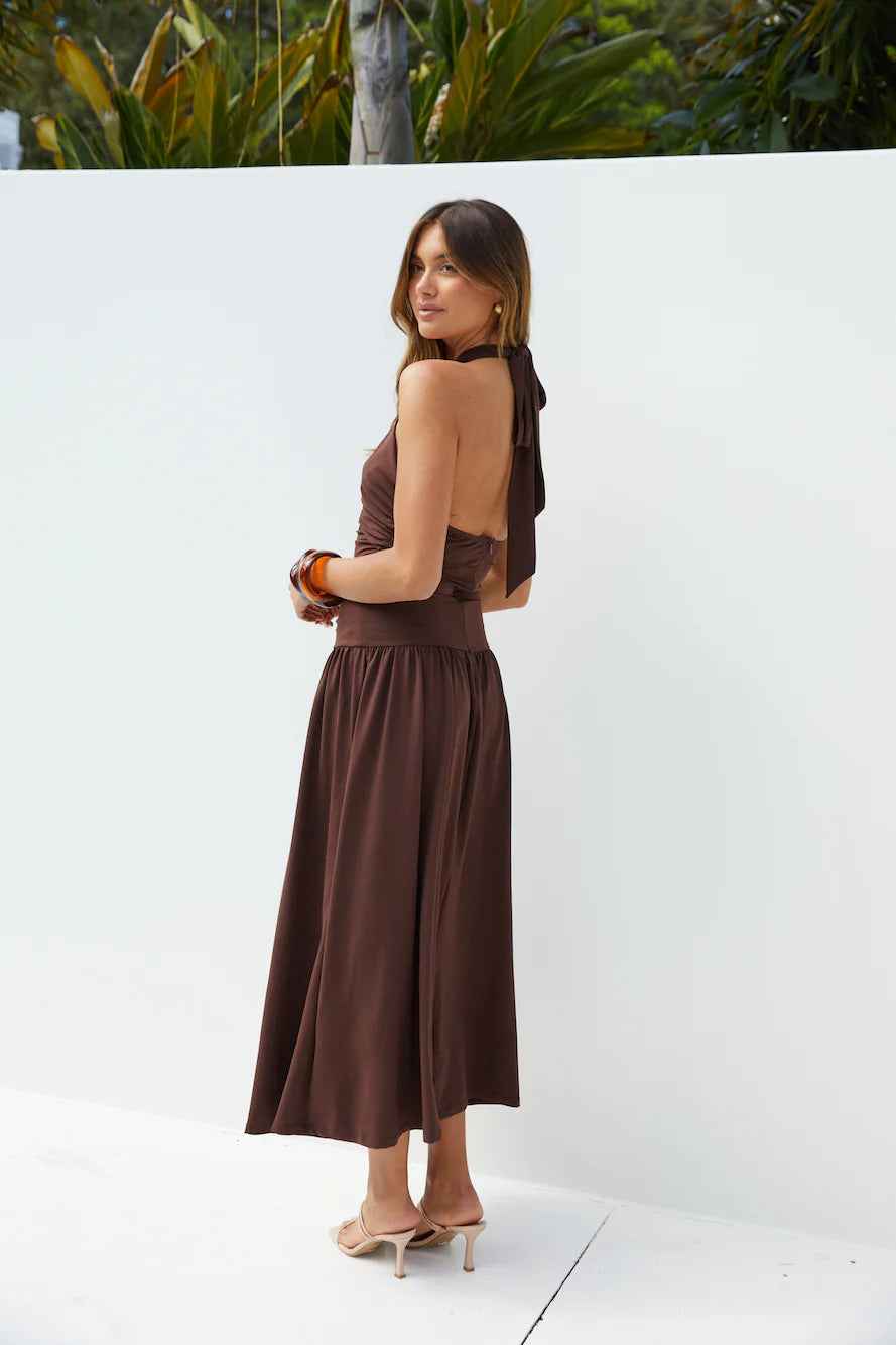 The Mocha Moments Maxi Dress in Brown is a showstopper in every sense. This stunning chocolate brown maxi features a chic halter neckline with an elegant crossover design, beautifully complemented by a daring cut-out center. The ruched waist flatters your silhouette, while the backless style adds a captivating touch of allure. Effortlessly blending sophistication and boldness, this dress is perfect for glamorous events, dreamy vacations, or romantic evenings. Slip into the Mocha Mirage and feel like your most radiant self.