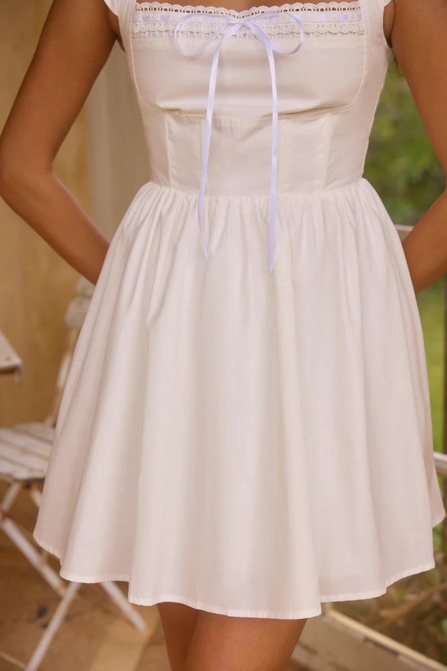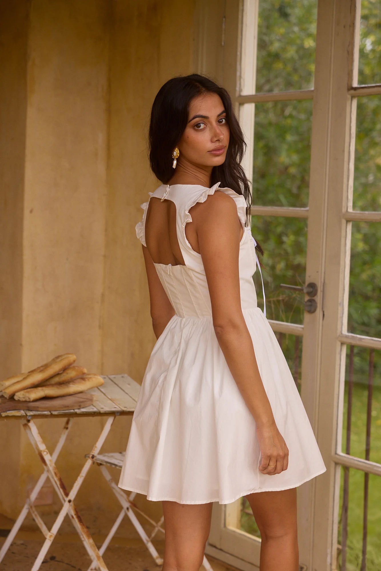 The Moonflower Melodies Mini Dress in white is an effortlessly sweet and feminine choice for daytime events. This charming mini dress features a corset-style waist that beautifully enhances your silhouette, while intricate lace and frill embroidery adorns the top, adding delicate detail and texture. Light and airy, this dress is perfect for garden parties, brunches, or any occasion you want to feel graceful and chic.