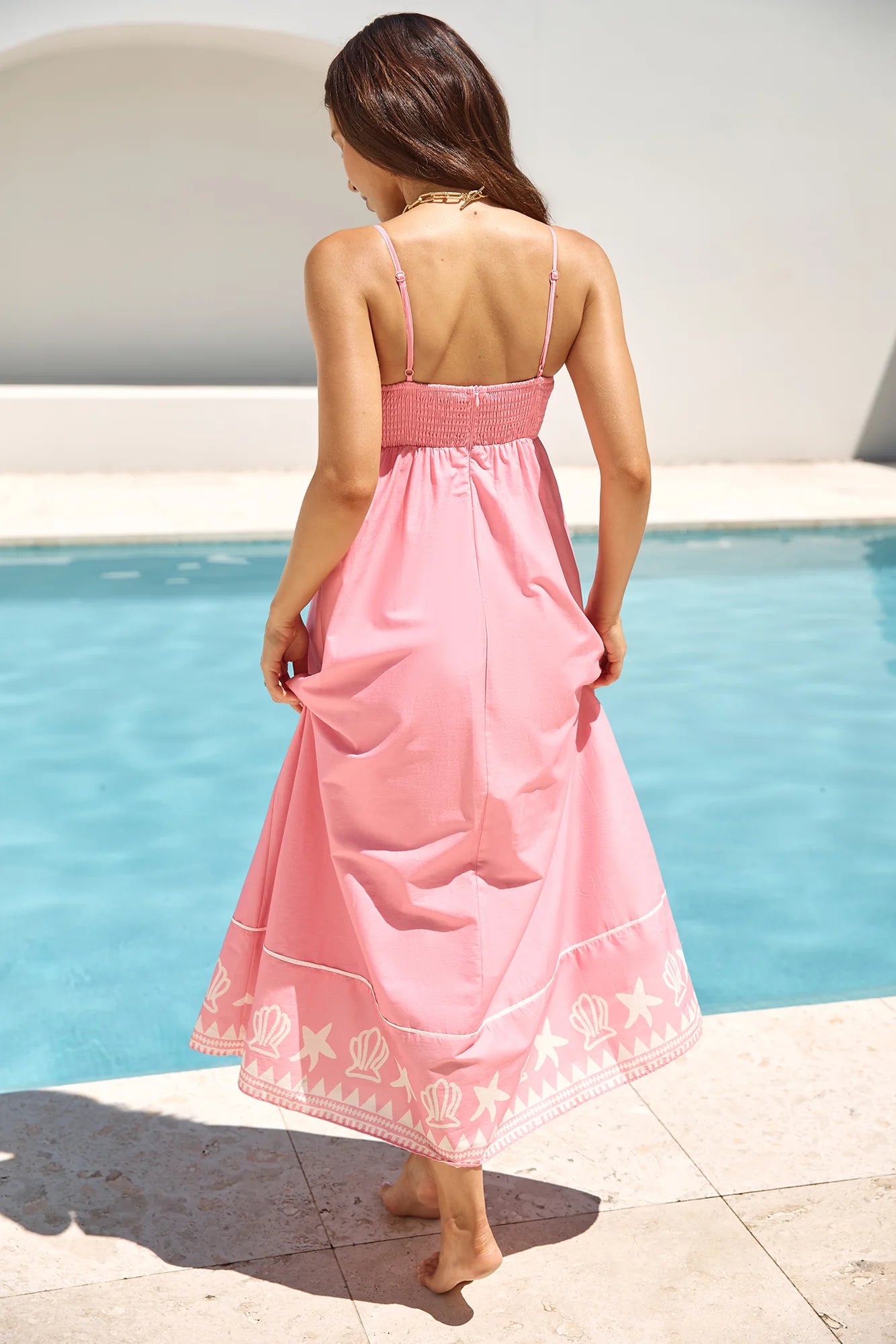 Float effortlessly through summer days in our Moving Islands Maxi Dress in Pink. With its flowing silhouette and vibrant hue, this dress embodies the spirit of sunny adventures and coastal charm.