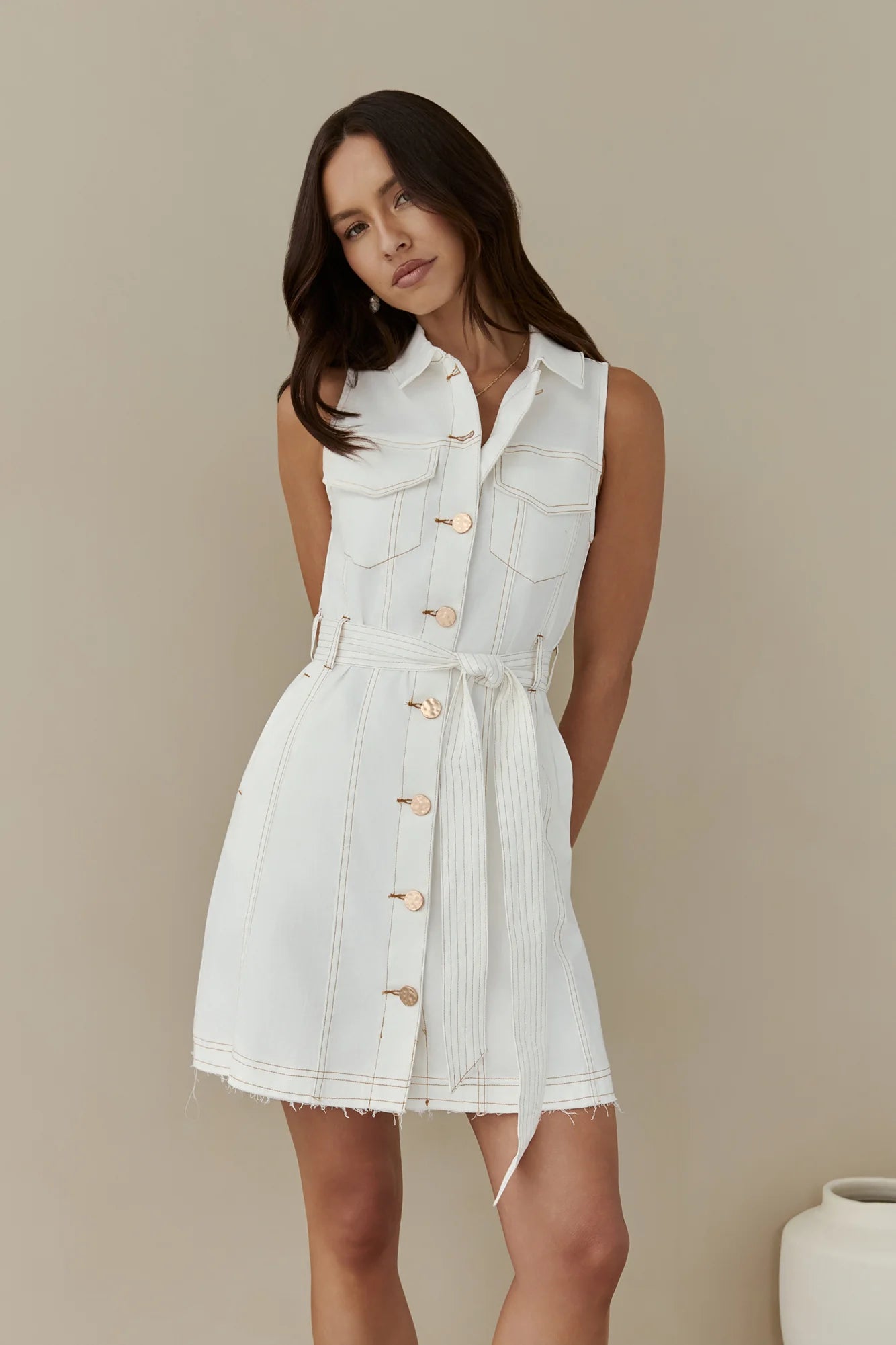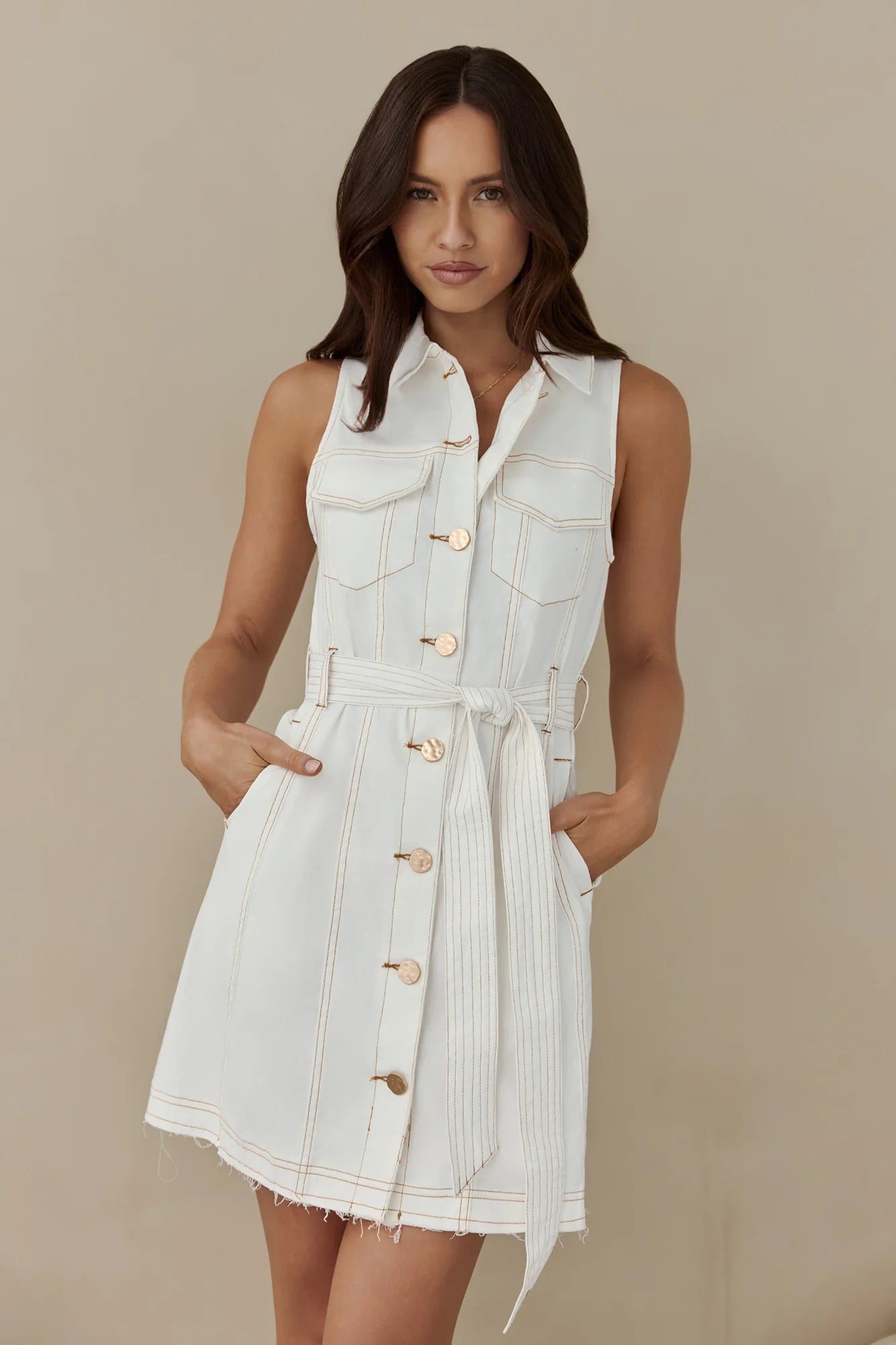 For the girl who’s always chasing the next destination. The Off Duty Explorer is your go-to mini for laid-back adventures and long weekends away. Made from soft stretch denim, it features a crisp collar, button-down front, and contrast stitching for that utility-inspired edge. The waist tie lets you define your shape, while front pockets bring function to the fashion. Unlined and easy to move in, this piece is made for road trips, rooftop sunsets, and everything in between.