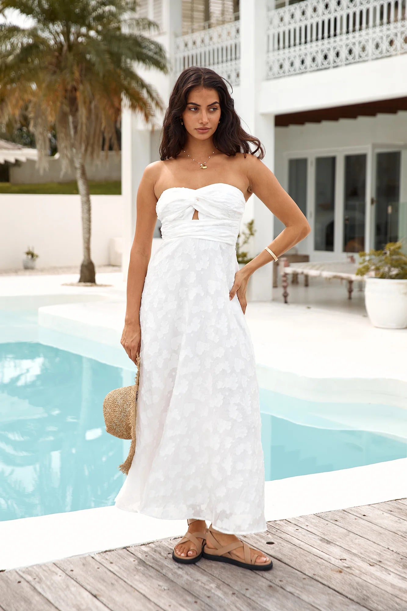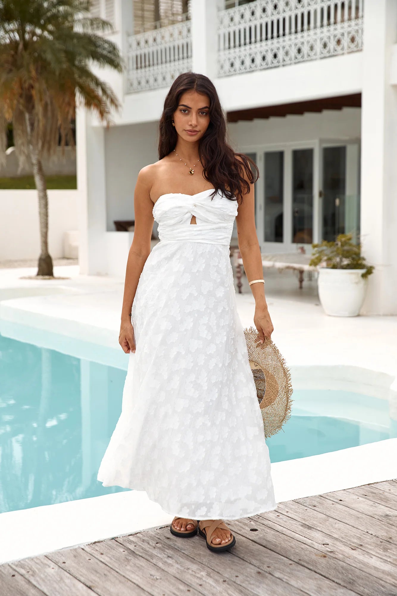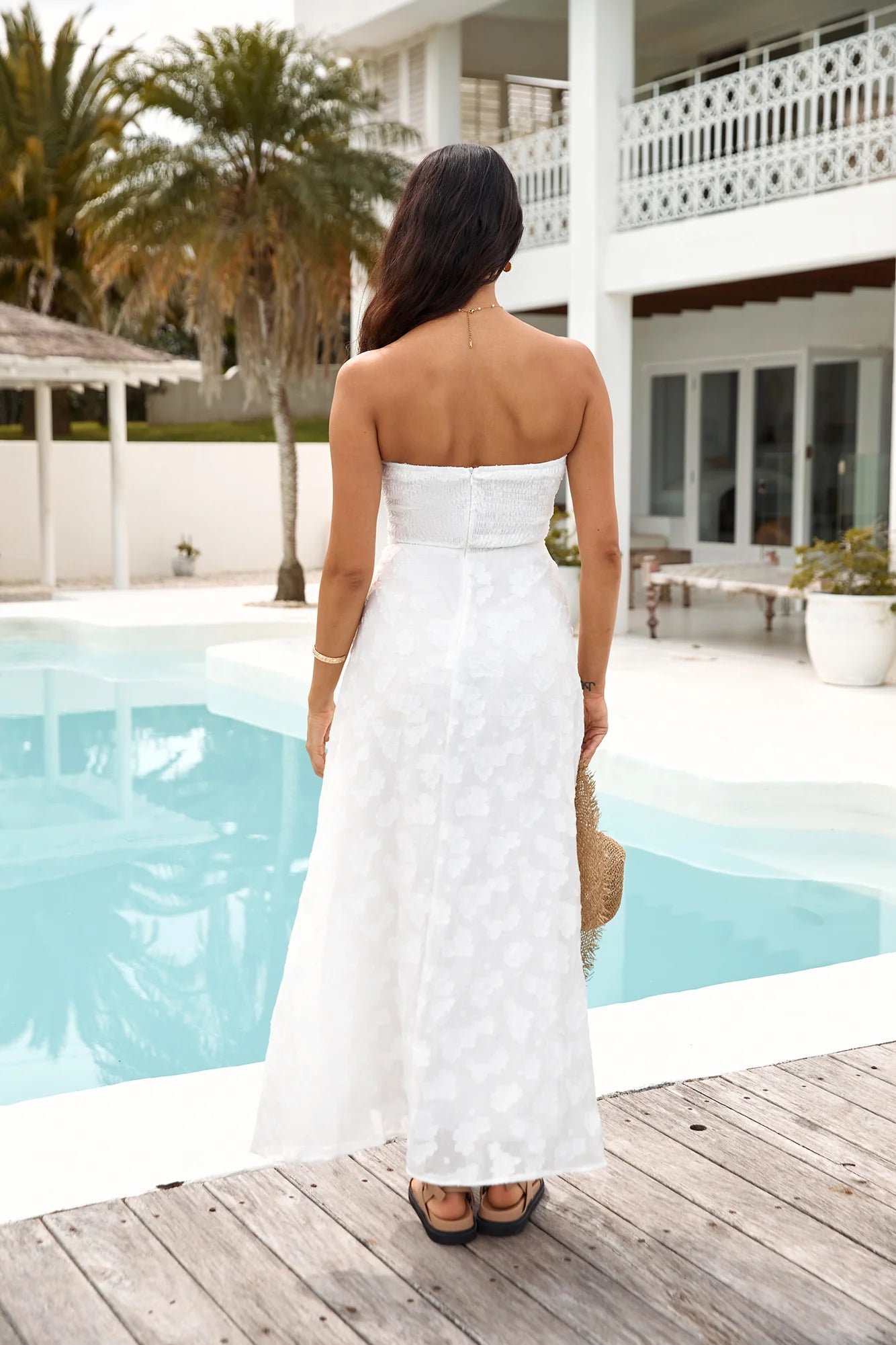 Introducing our Orchid Bouquet Strapless Maxi Dress in White. Embrace summer elegance with this stunning piece, ideal for weddings, garden parties, or any occasion where you want to exude effortless beauty.