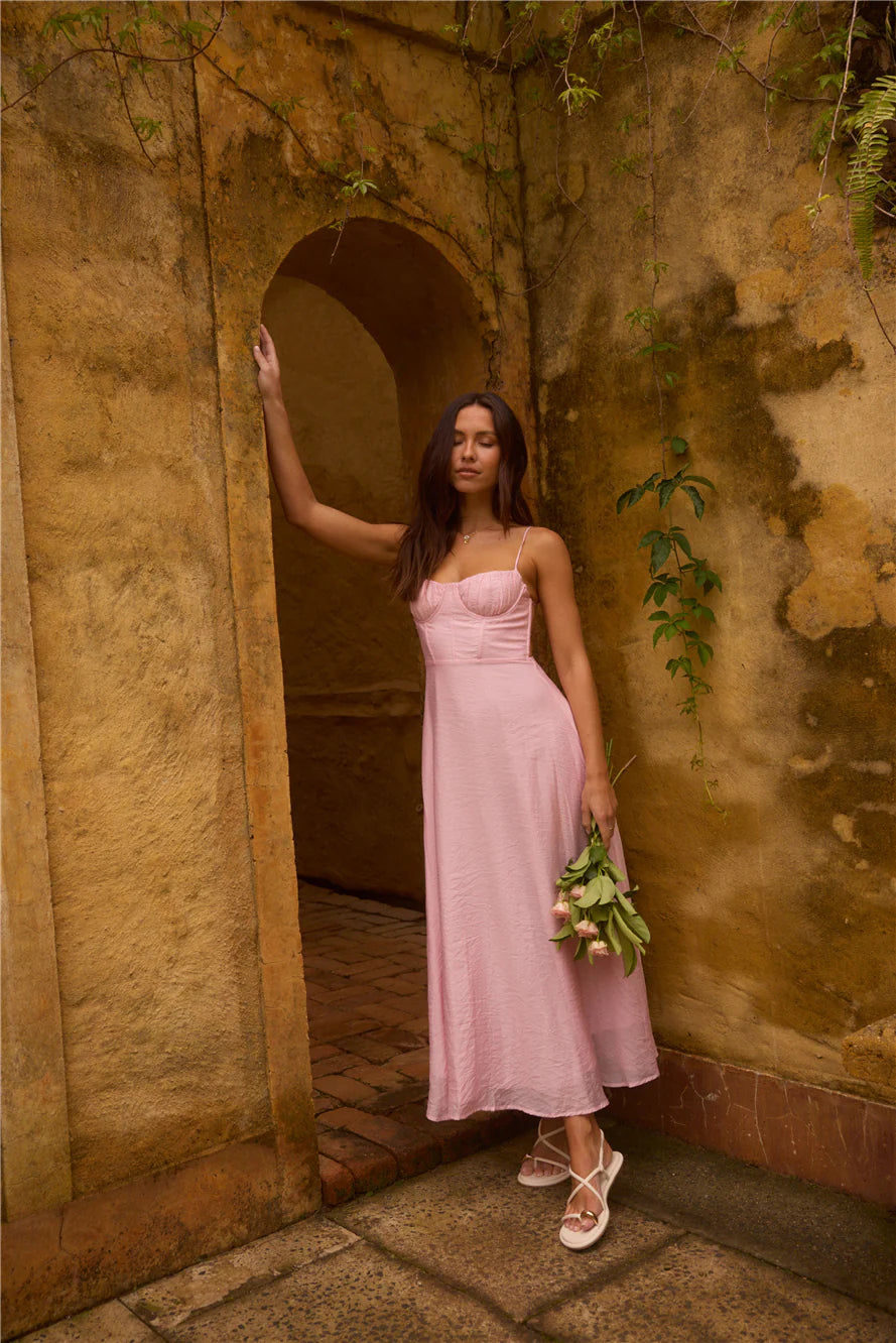 Petals on the Wind Maxi Dress in Pink is your perfect choice for any upcoming event. Its enchanting corset-style waist enhances your silhouette, adding a touch of elegance and flair. This dress flows beautifully, making it ideal for twirling on the dance floor or enjoying a sunny garden party. Complete your look with strappy sandals or open-toe heels for a chic finish that’s sure to turn heads.