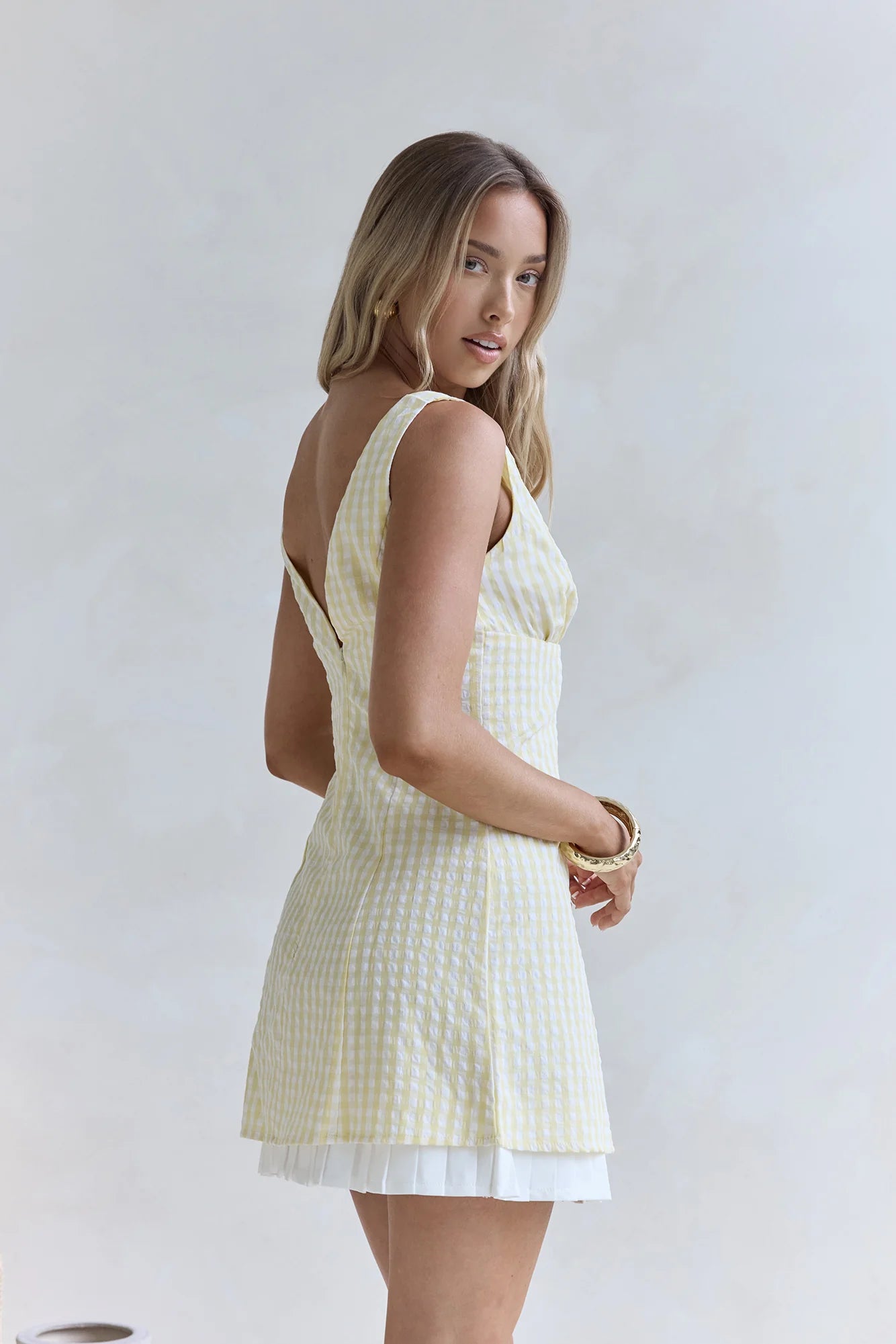 Float through sun-drenched afternoons in our sweetly sophisticated Picnic Perfect Mini Dress in Yellow. The nostalgic blue and white gingham pattern captures the essence of carefree summer days, while the feminine bustier-style bodice and playful ruffle hem add a modern twist to this classic silhouette.